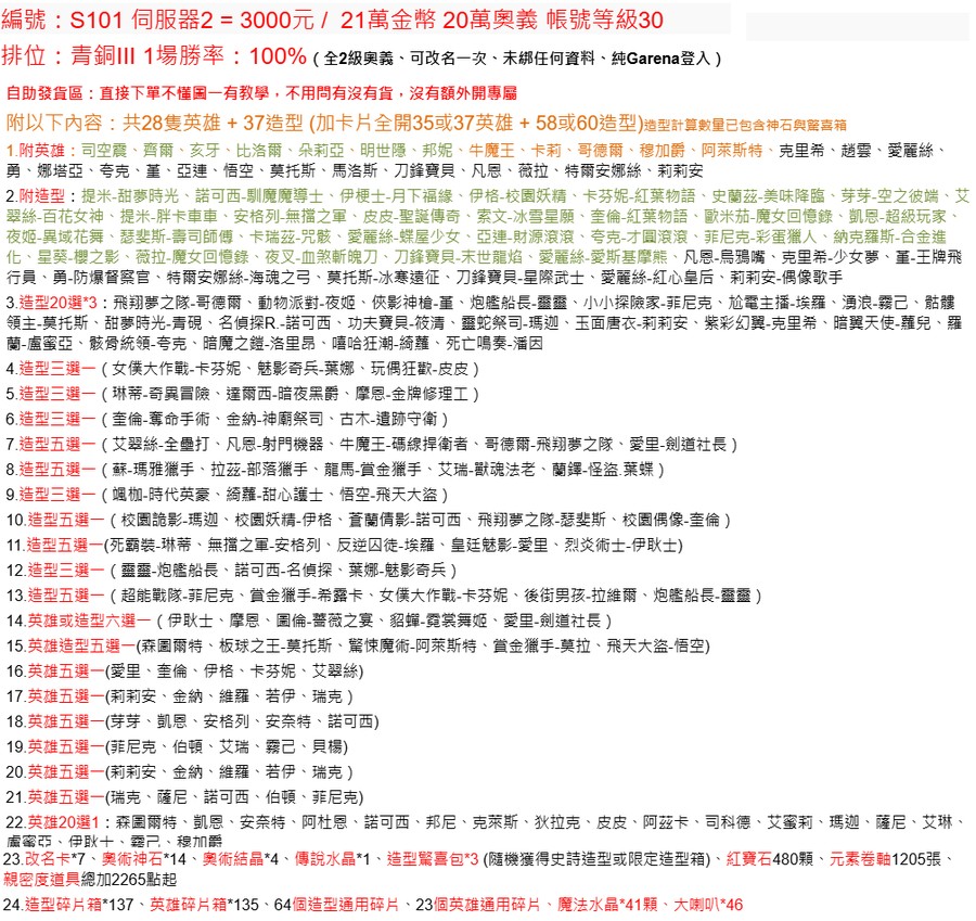 編號:S101 伺服器2 = 3000元 / 21萬金幣 20萬奧義 帳號等級30