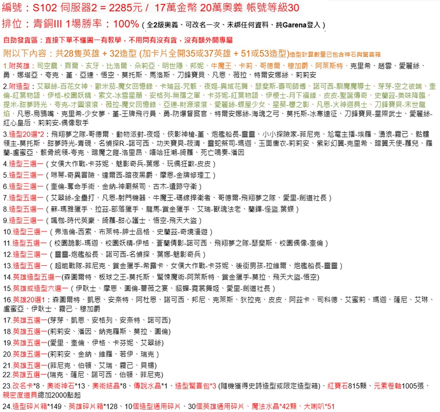 編號:S102 伺服器2 = 2285元 / 17萬金幣 20萬奧義 帳號等級30