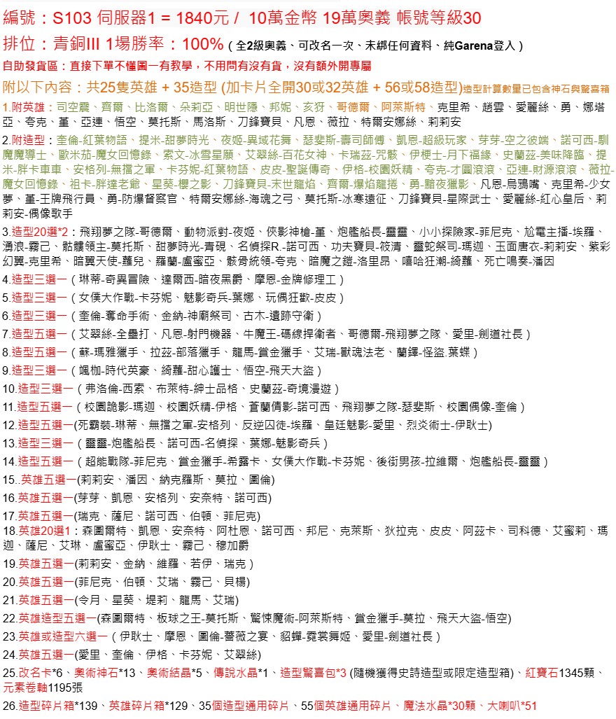 編號:S103 伺服器1 = 1840元 / 10萬金幣 19萬奧義 帳號等級30