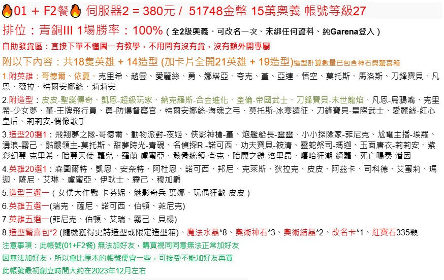 🔥01 + F2餐🔥 伺服器2 = 380元 / 51748金幣 15萬奧義 帳號等級27