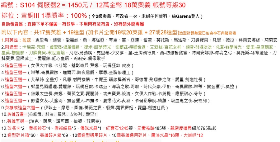 附以下內容:共17隻英雄 + 19造型 (加卡片全開19或20英雄 + 27或28造型)造型計算數量已包含神石與驚喜箱