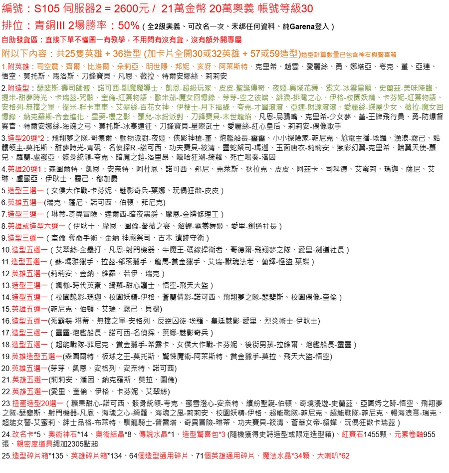編號:S105 伺服器2 = 2600元 / 21萬金幣 20萬奧義 帳號等級30
