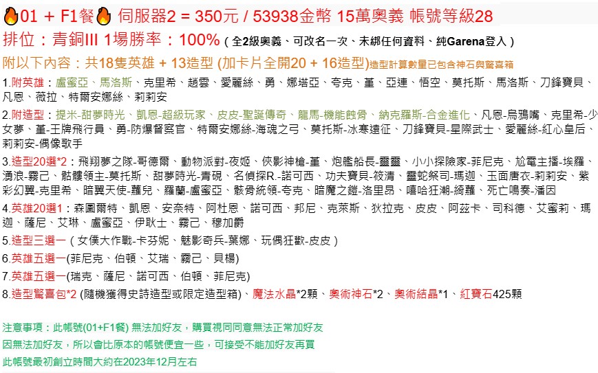 🔥01 + F1餐🔥 伺服器2 = 350元 / 53938金幣 15萬奧義 帳號等級28