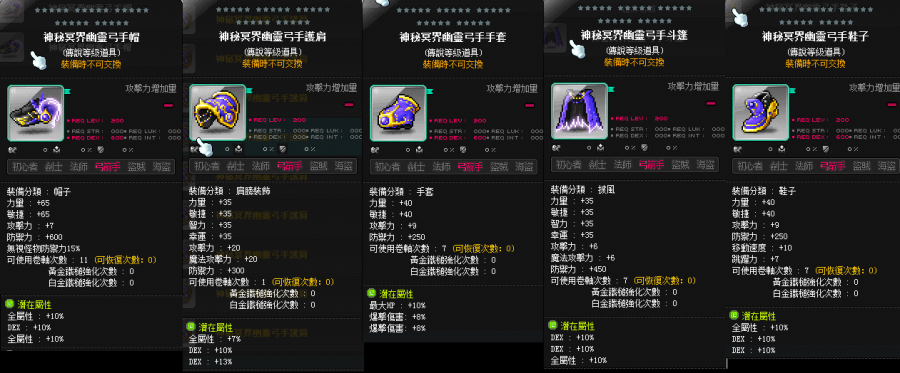 道具 傳說神秘防具:200神秘冥界幽靈弓手一套(單件傳說30%) 200弓箭手5SET