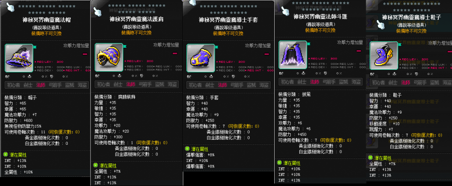道具 傳說神秘防具:200神秘冥界幽靈法師一套(單件傳說33%) 200法師5SET
