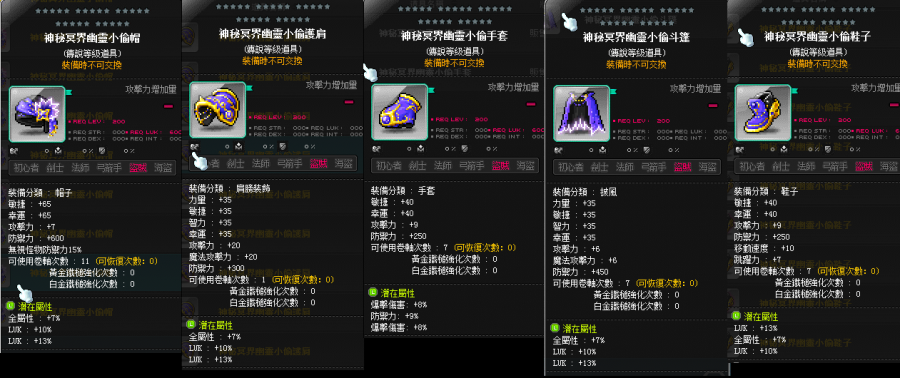 道具 傳說神秘防具:200神秘冥界幽靈盜賊一套(單件傳說30%) 200盜賊5SET