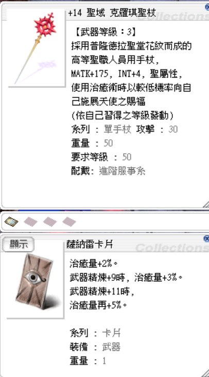 道具 +9聖天使護士帽、念珠十字架項鍊、+14克羅琪聖杖、大祭司聖戒(完迴完全迴避)