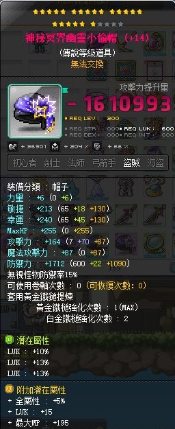 道具 【神秘冥界幽靈小偷帽】 成品36幸附加罕見白鎚+2 神秘賊帽