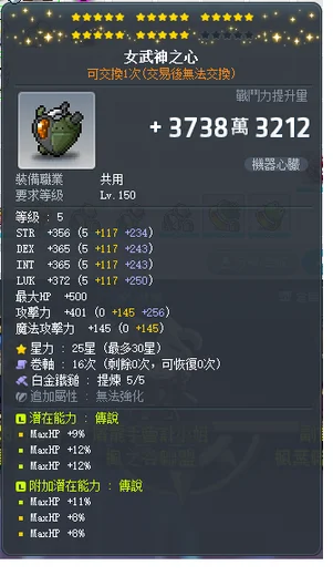 武器及心臟這兩件可以全艾比卷裝備全身皆為稀有潛能大部分都洗好雙排 星力大概12-14