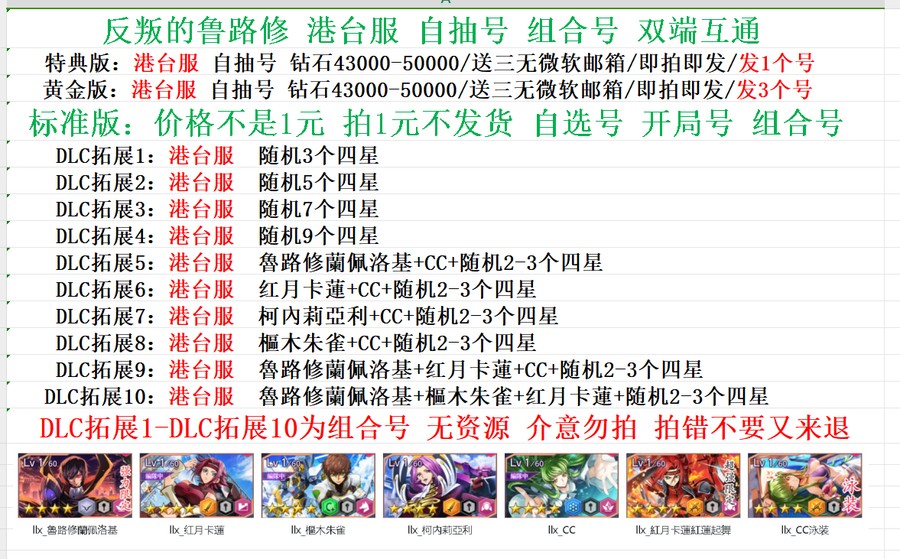 全 8591 首家 Code Geass反叛的魯路修失落物語初始號自選開局組合港台服自抽號
