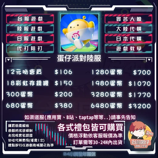 代儲【6480蛋幣=3200元】 🔥蛋仔派對陸服台灣囝仔24H服務中🏆網易官方認證
