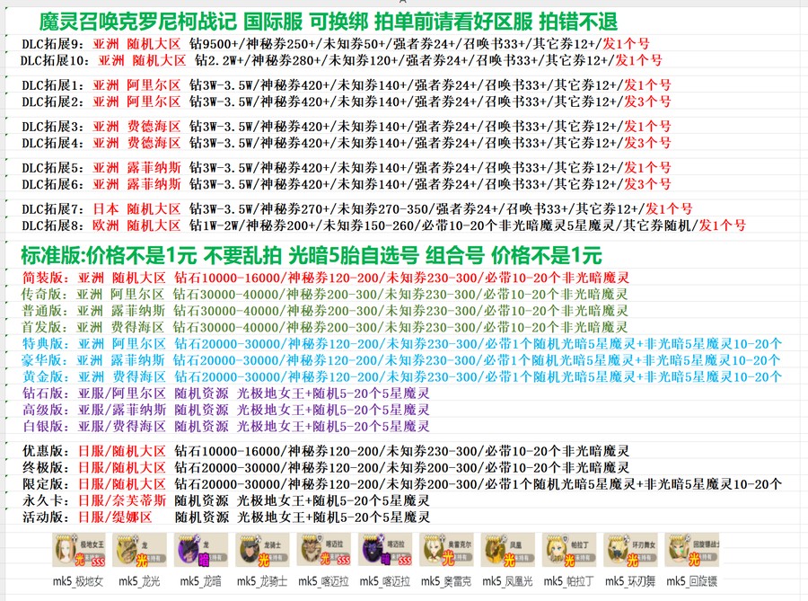 全 8591 首家 魔靈召喚克羅尼柯戰記初始自選光暗光奶胎五組合首抽全球服自抽號