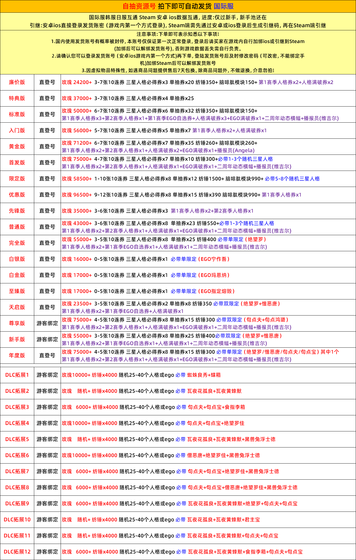 遊戲帳號內容已清楚打出來 沒打出來的皆為隨機附送 不要自己亂加東西 資源 再說帳號上怎沒有 後續出現問題 一律以賣家公布為主 介意勿買