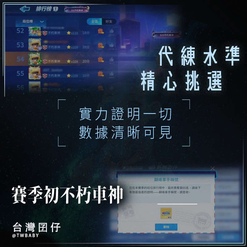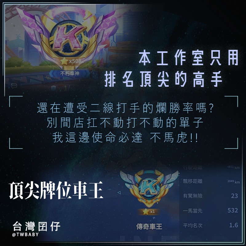 👉是真正在季初就打上不朽車神&最強車神的團隊,旗下作業跑者也都是台服&國服/王者車手&傳奇車王🏆