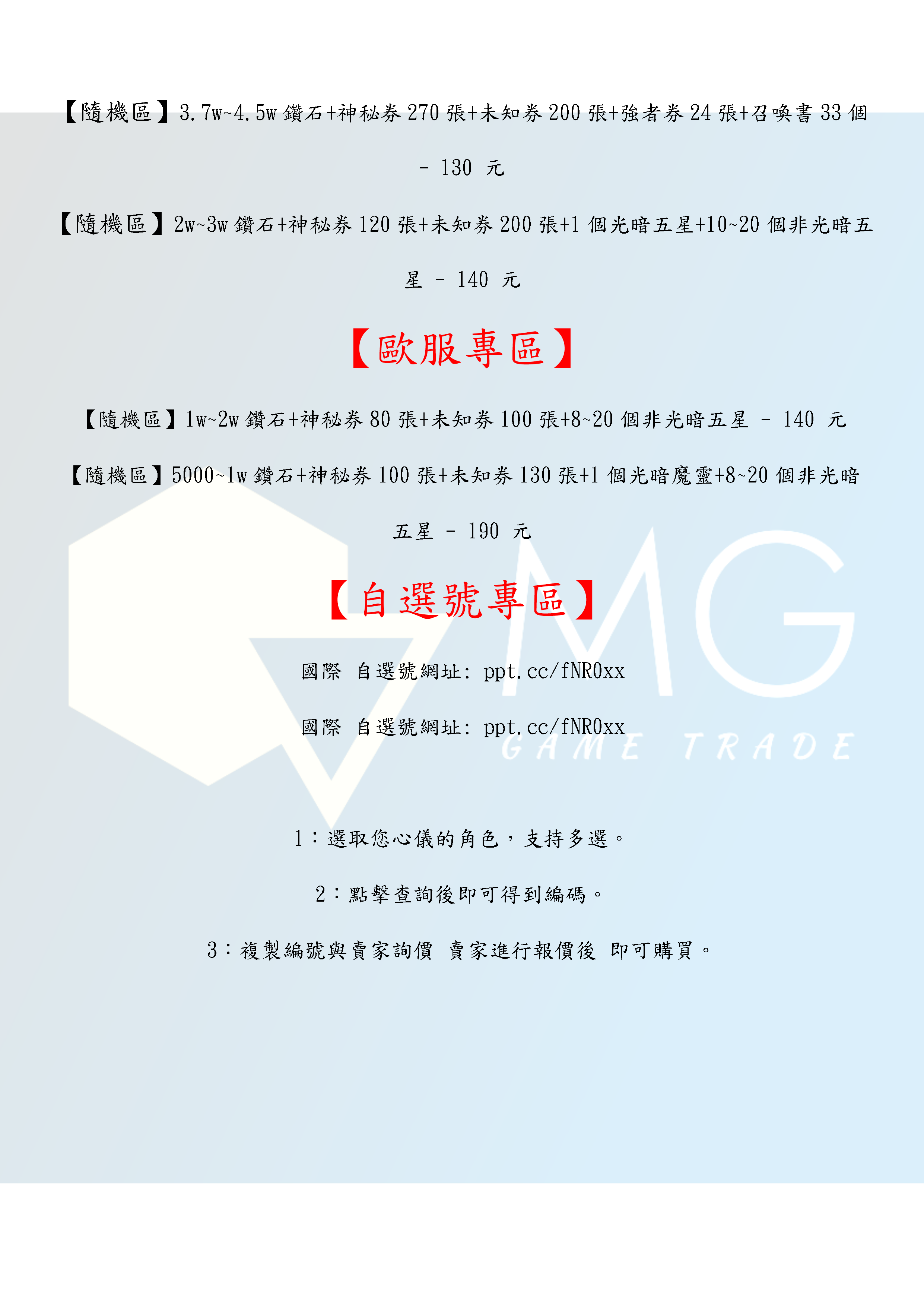 帳號 【初始號】 【MG數碼】 亞服 台服 日服 歐服 多石號 初始號 自抽號 自選號 自選組合