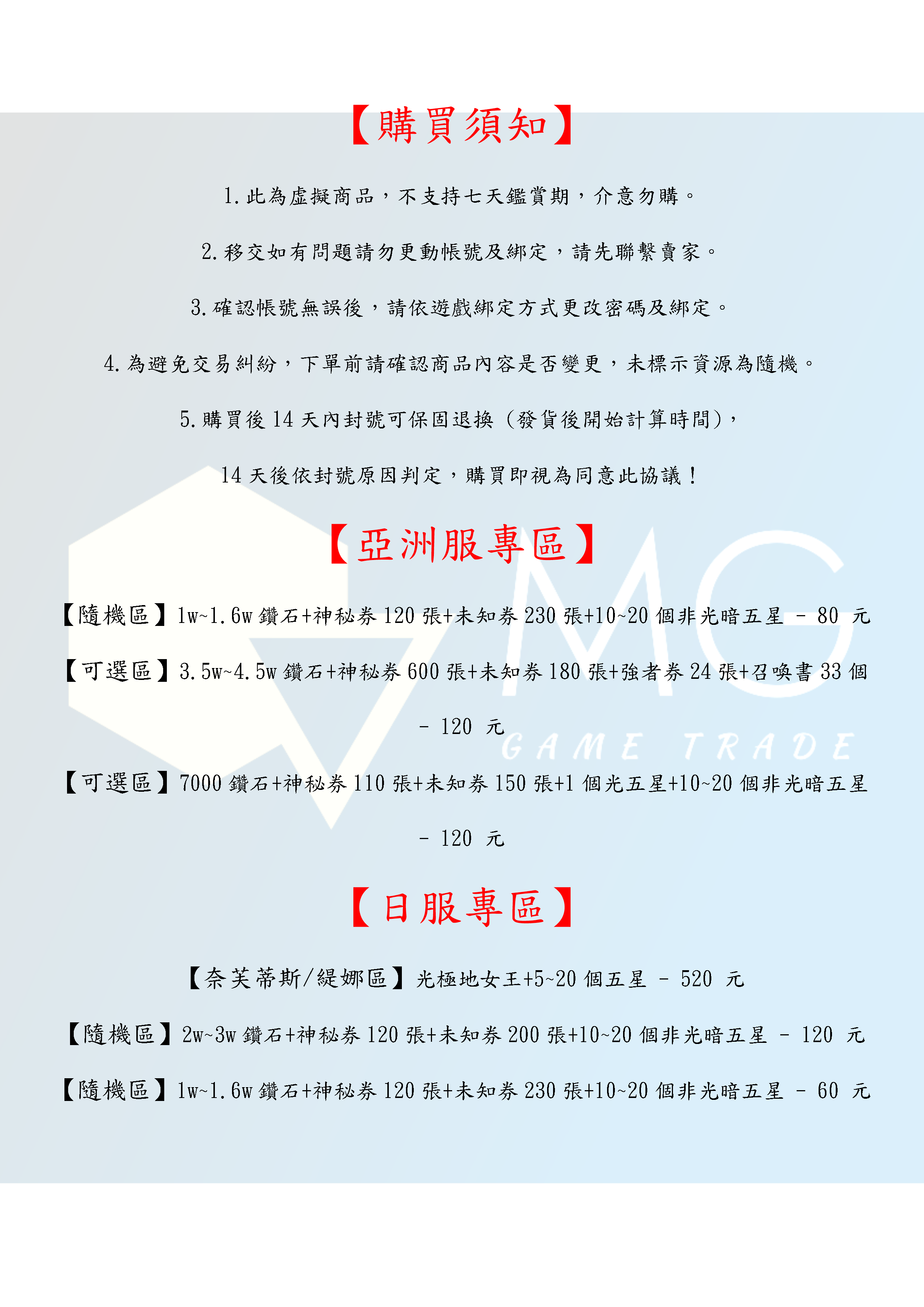 帳號 【初始號】 【MG數碼】 亞服 台服 日服 歐服 多石號 初始號 自抽號 自選號 自選組合