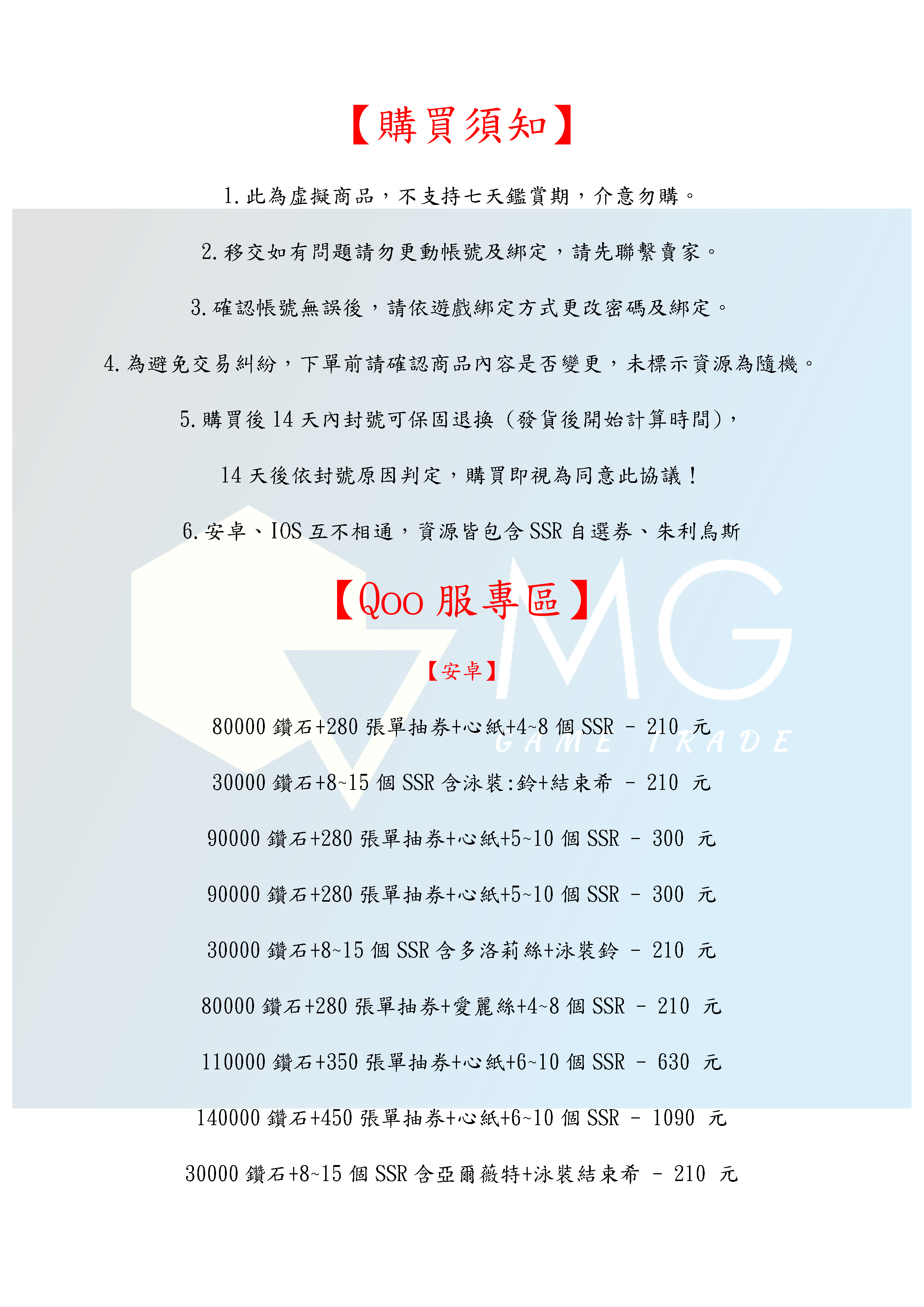 3.交易時確認帳號資源無誤後,切記依照遊戲綁定方式更改密碼以及綁定。