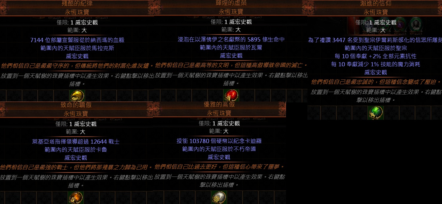 道具 PoE永恆珠寶→殘酷的紀律、優雅的高傲、輝煌的虛榮、致命的驕傲、激進的信仰珠寶