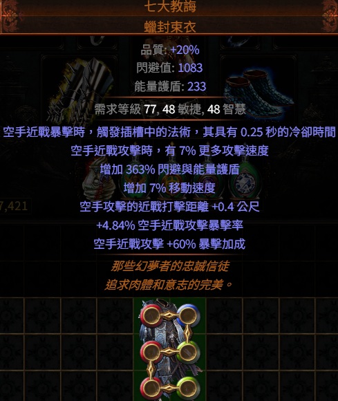 道具 PoE打擊👌傳奇→七大教誨.蠟封束衣 (近戰暴擊觸發法術 / 空手暴擊加成)