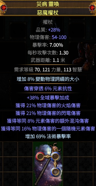 道具 PoE提供複製👍災病.靈喚之惡魔權杖 (獲得物理火焰、閃電傷害、混沌元素傷害