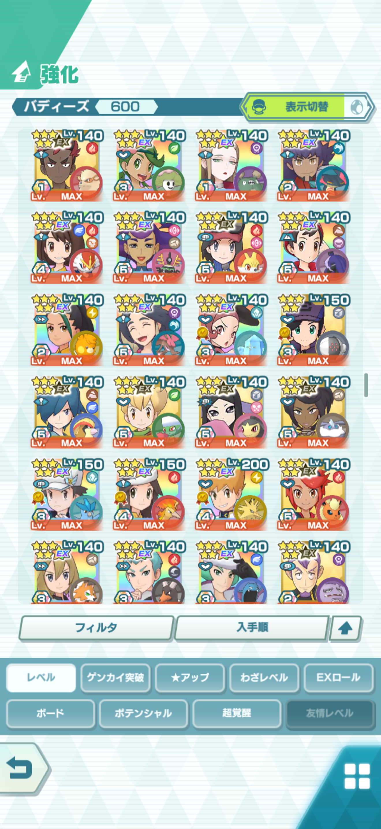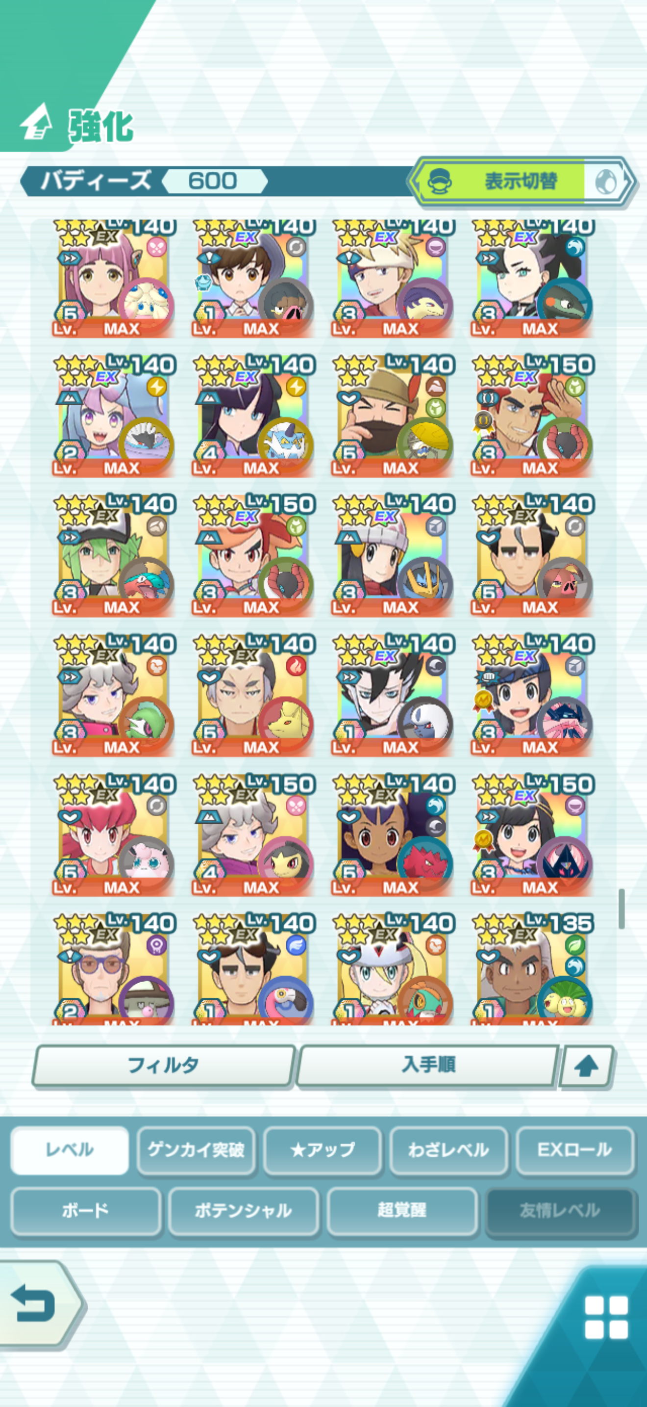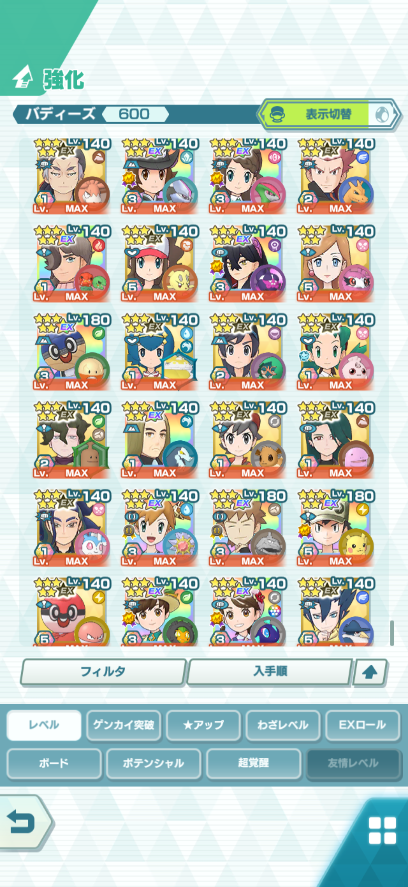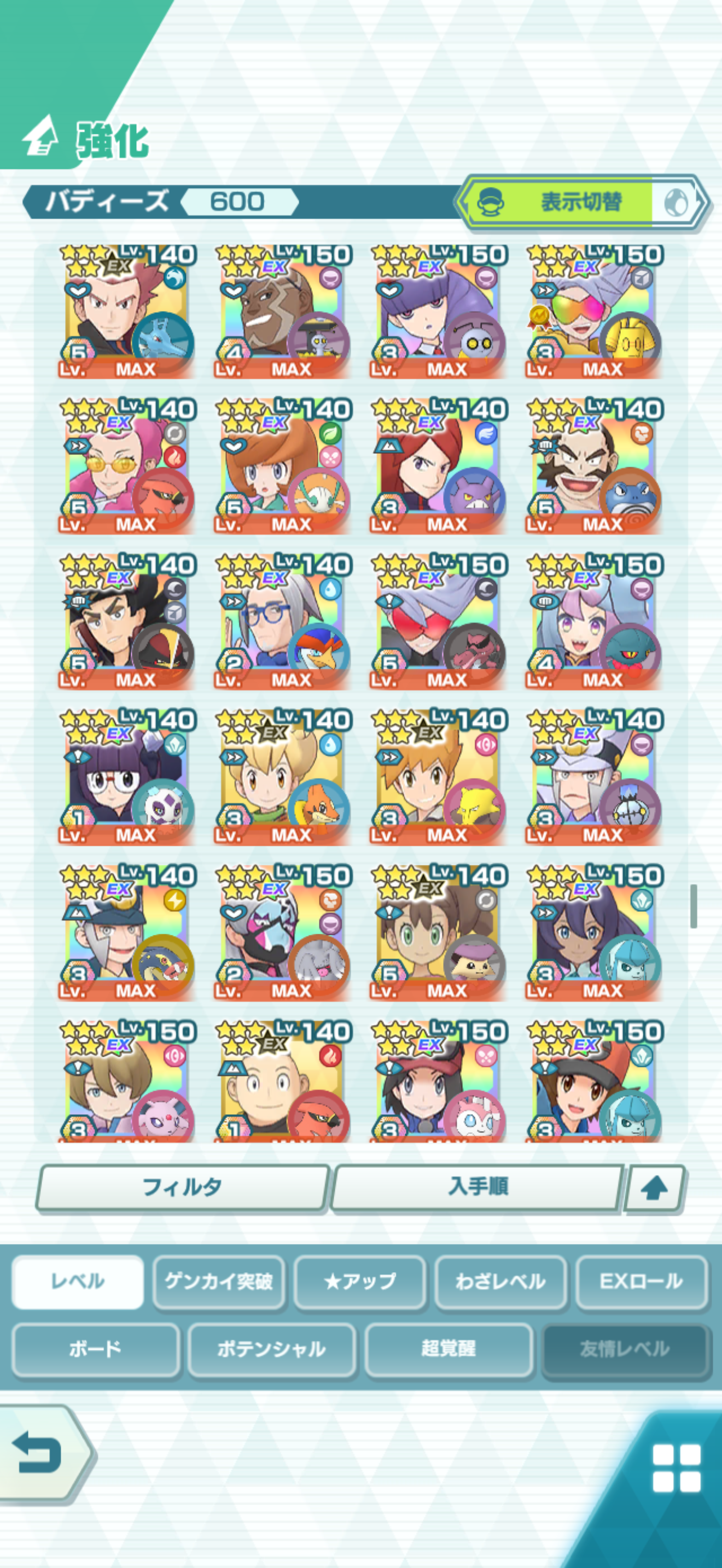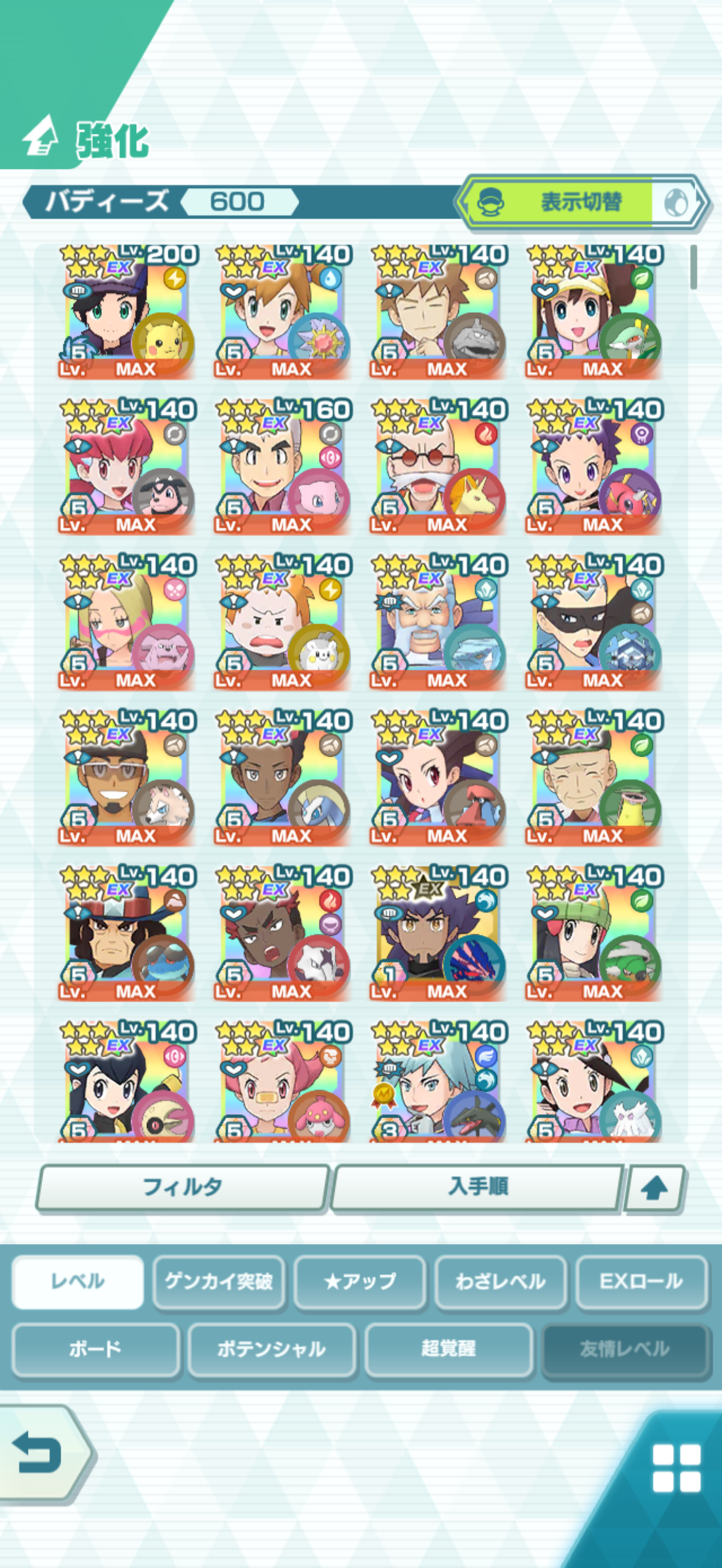 全大師拍組!!(包括兌換的大師拍組),目前全8591最高所持數(而且此所持數是不包含蛋寵!!!!)。圖鑑(600/611) 只有15角色沒拿到(實際上只有12隻沒拿到,扣掉初始御三家3隻,分別剩主角-雙奶仙(剩下5種樣子)、武藏-阿伯怪、小次郎-雙蛋瓦斯、小霞-哥達鴨(沙龍親密度未滿)。除了這15隻,這帳號擁有遊戲中所有登場的拍組。阿爾池、大師池、季節池、活動池、兌換角色、沙龍)~