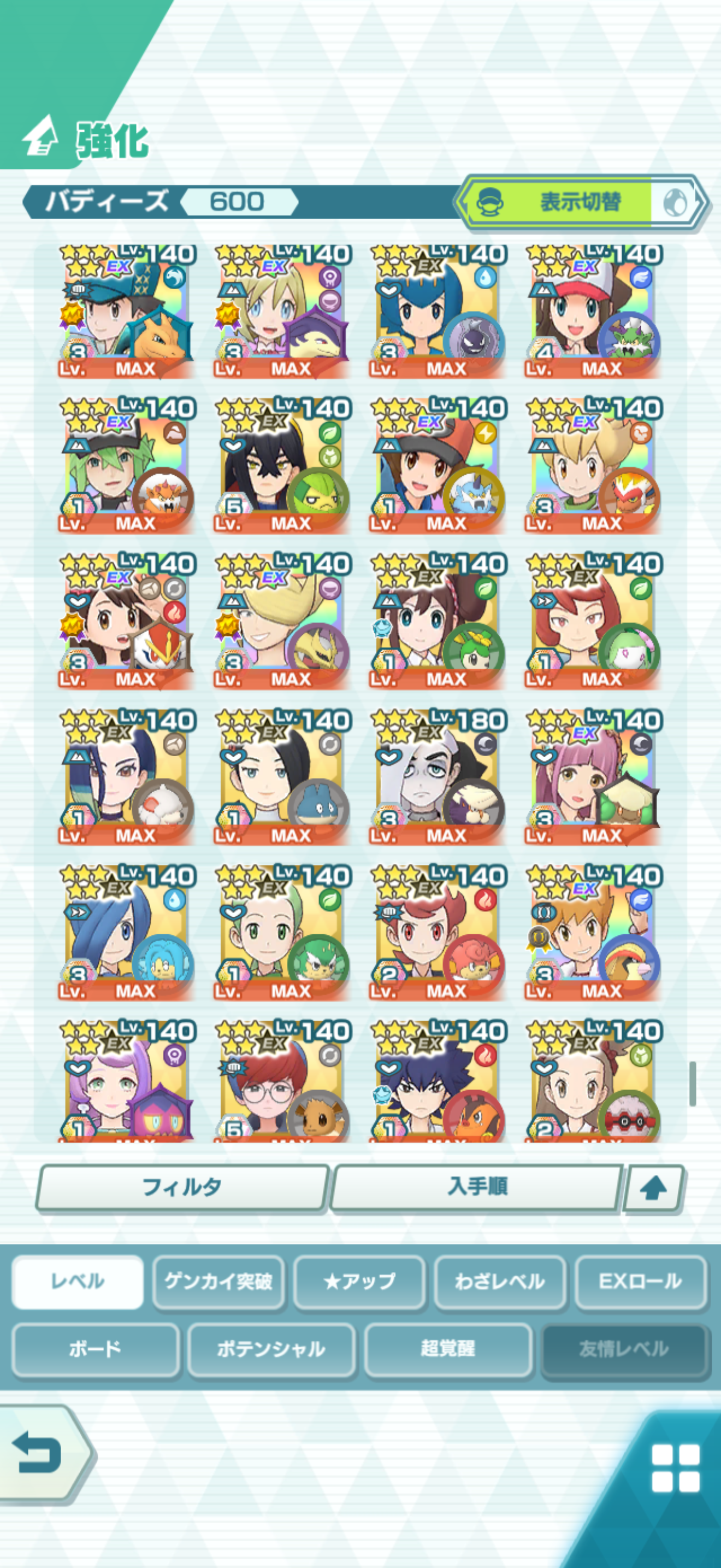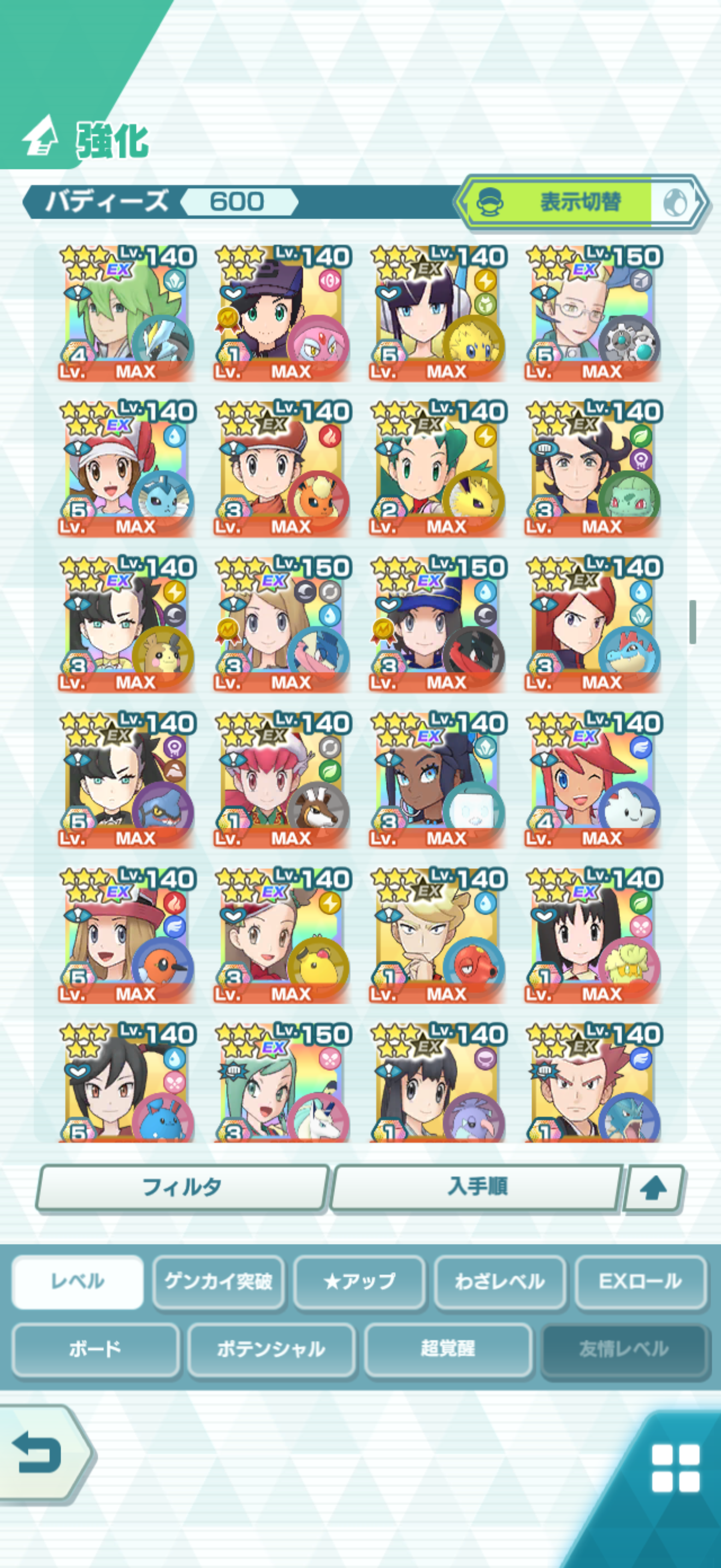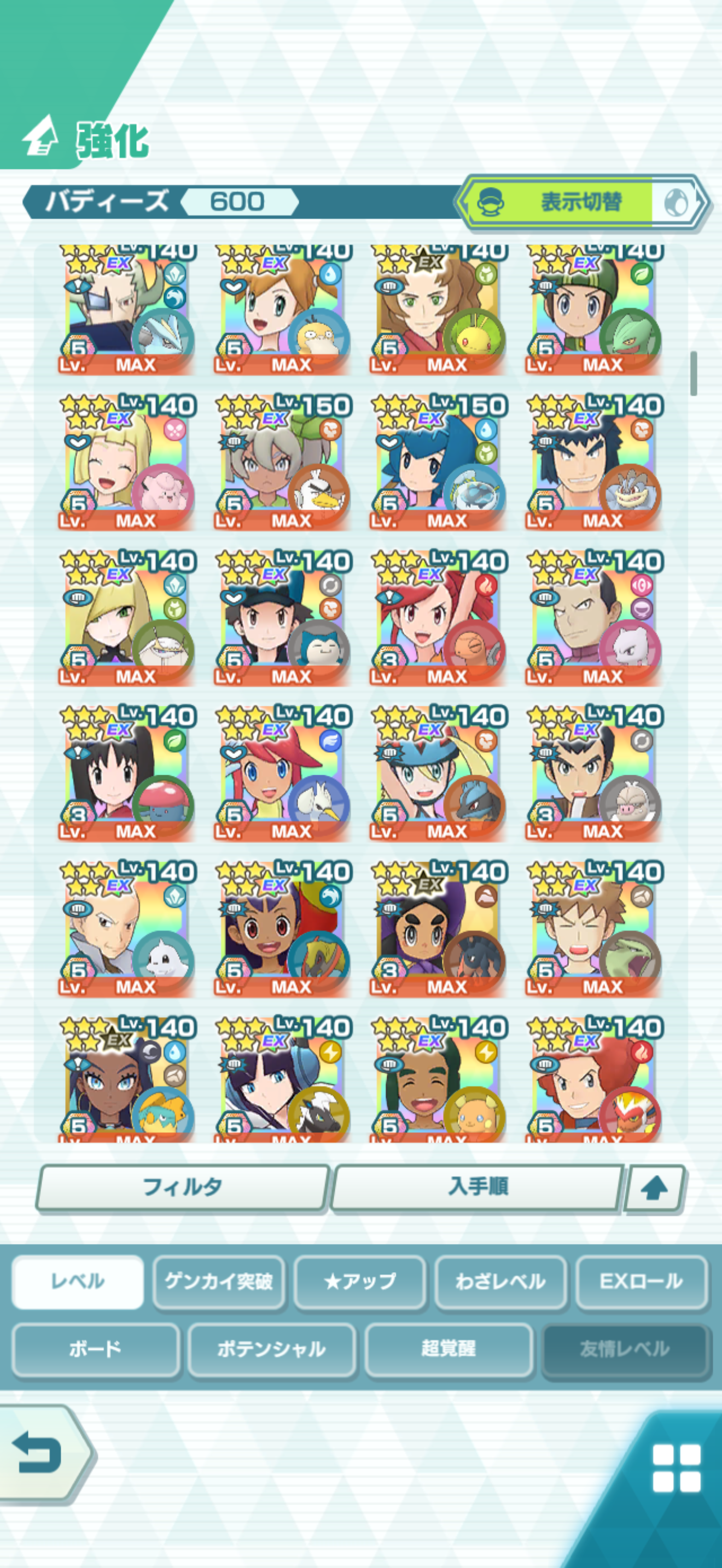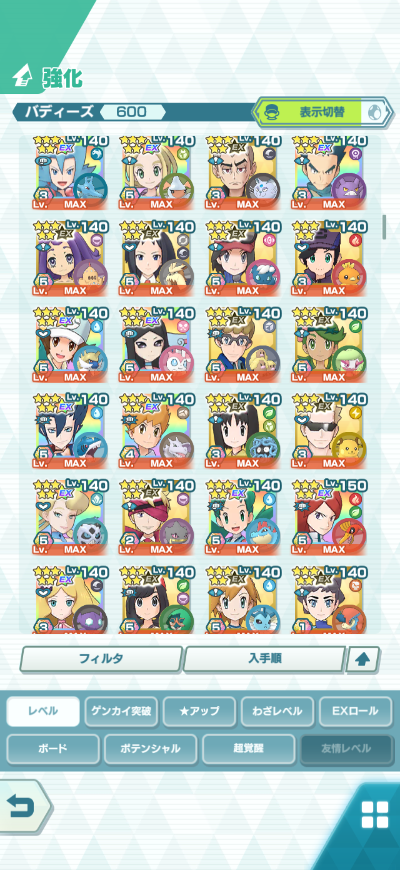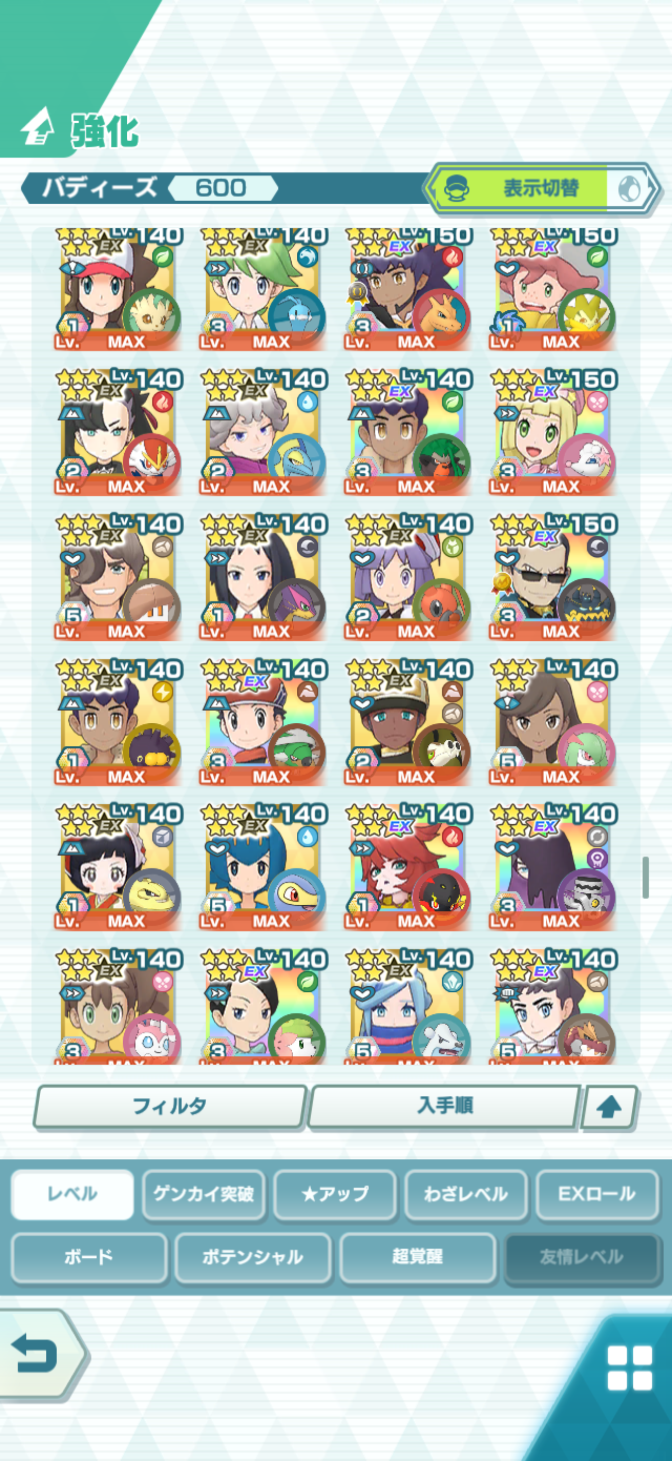 全大師拍組!!(包括兌換的大師拍組),目前全8591最高所持數(而且此所持數是不包含蛋寵!!!!)。圖鑑(600/611) 只有15角色沒拿到(實際上只有12隻沒拿到,扣掉初始御三家3隻,分別剩主角-雙奶仙(剩下5種樣子)、武藏-阿伯怪、小次郎-雙蛋瓦斯、小霞-哥達鴨(沙龍親密度未滿)。除了這15隻,這帳號擁有遊戲中所有登場的拍組。阿爾池、大師池、季節池、活動池、兌換角色、沙龍)~