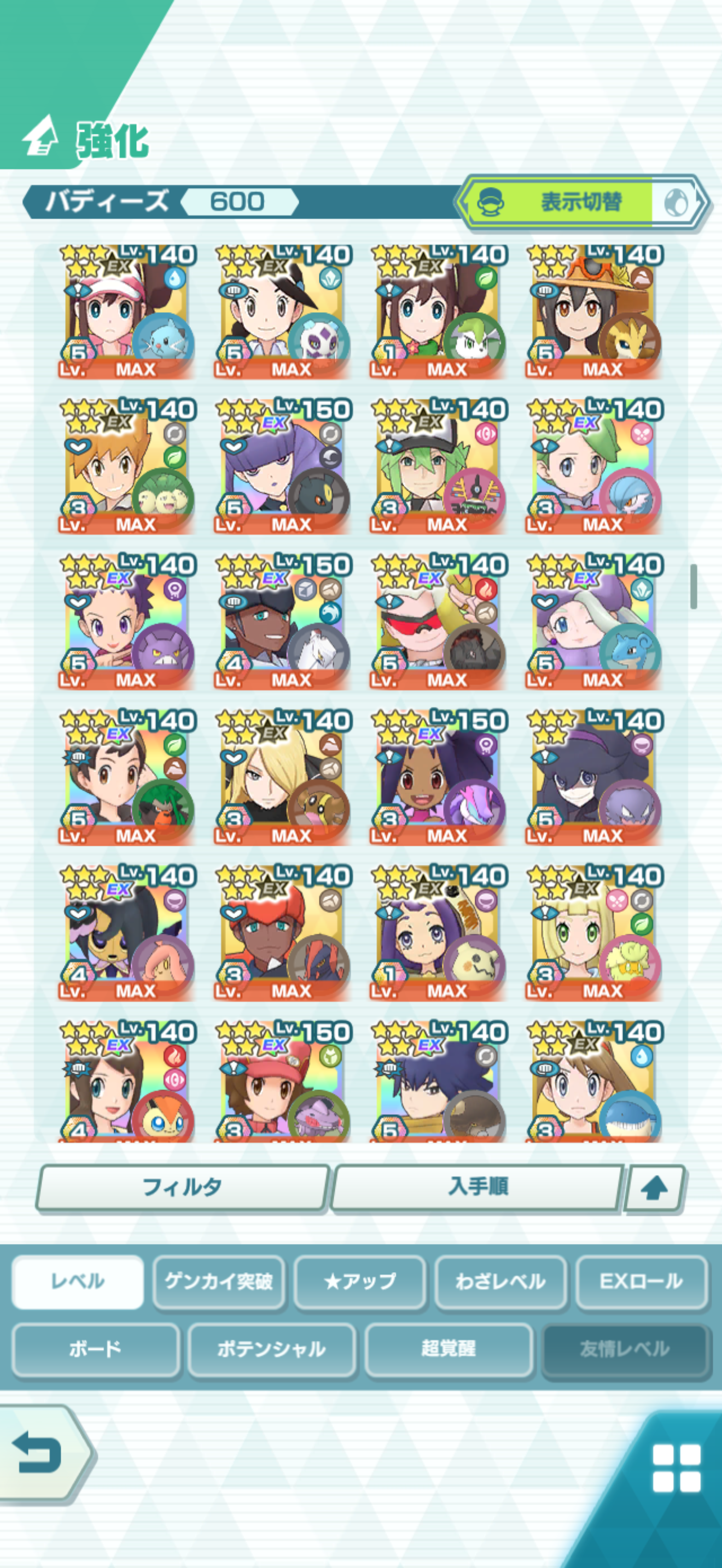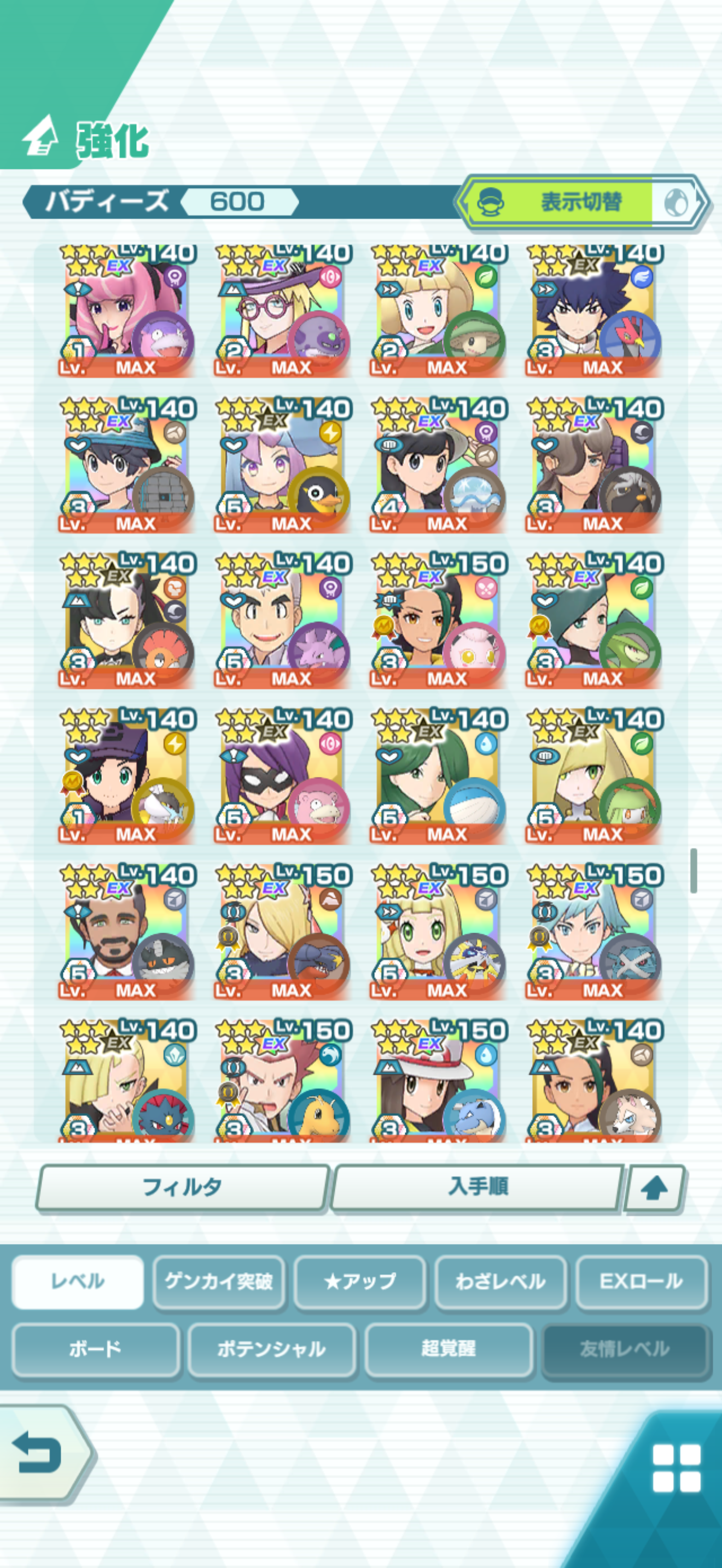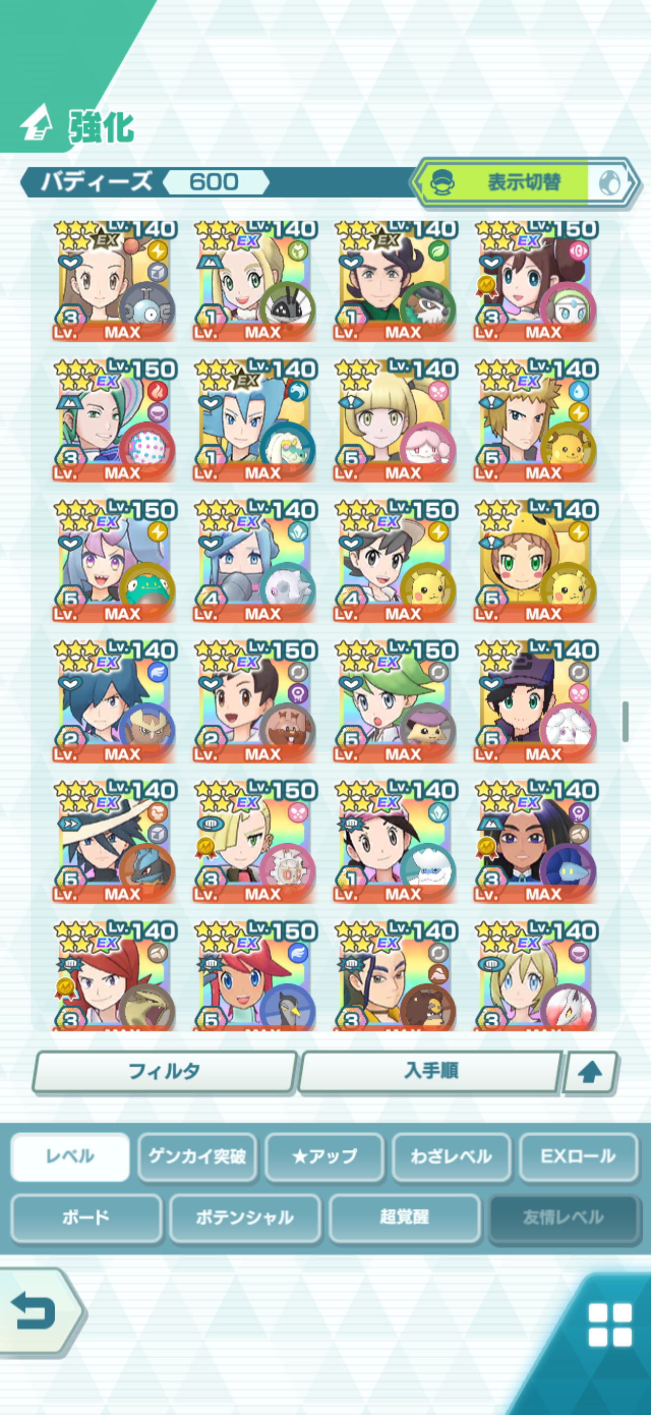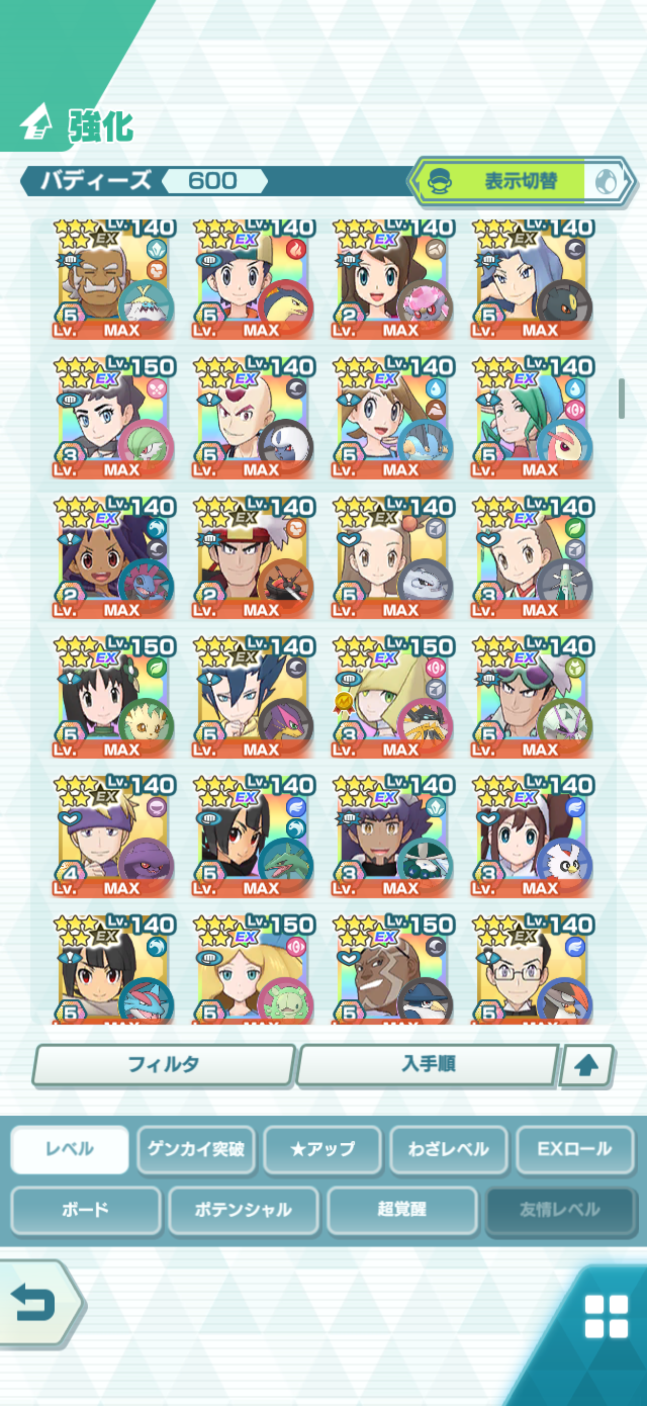 全大師拍組!!(包括兌換的大師拍組),目前全8591最高所持數(而且此所持數是不包含蛋寵!!!!)。圖鑑(600/611) 只有15角色沒拿到(實際上只有12隻沒拿到,扣掉初始御三家3隻,分別剩主角-雙奶仙(剩下5種樣子)、武藏-阿伯怪、小次郎-雙蛋瓦斯、小霞-哥達鴨(沙龍親密度未滿)。除了這15隻,這帳號擁有遊戲中所有登場的拍組。阿爾池、大師池、季節池、活動池、兌換角色、沙龍)~