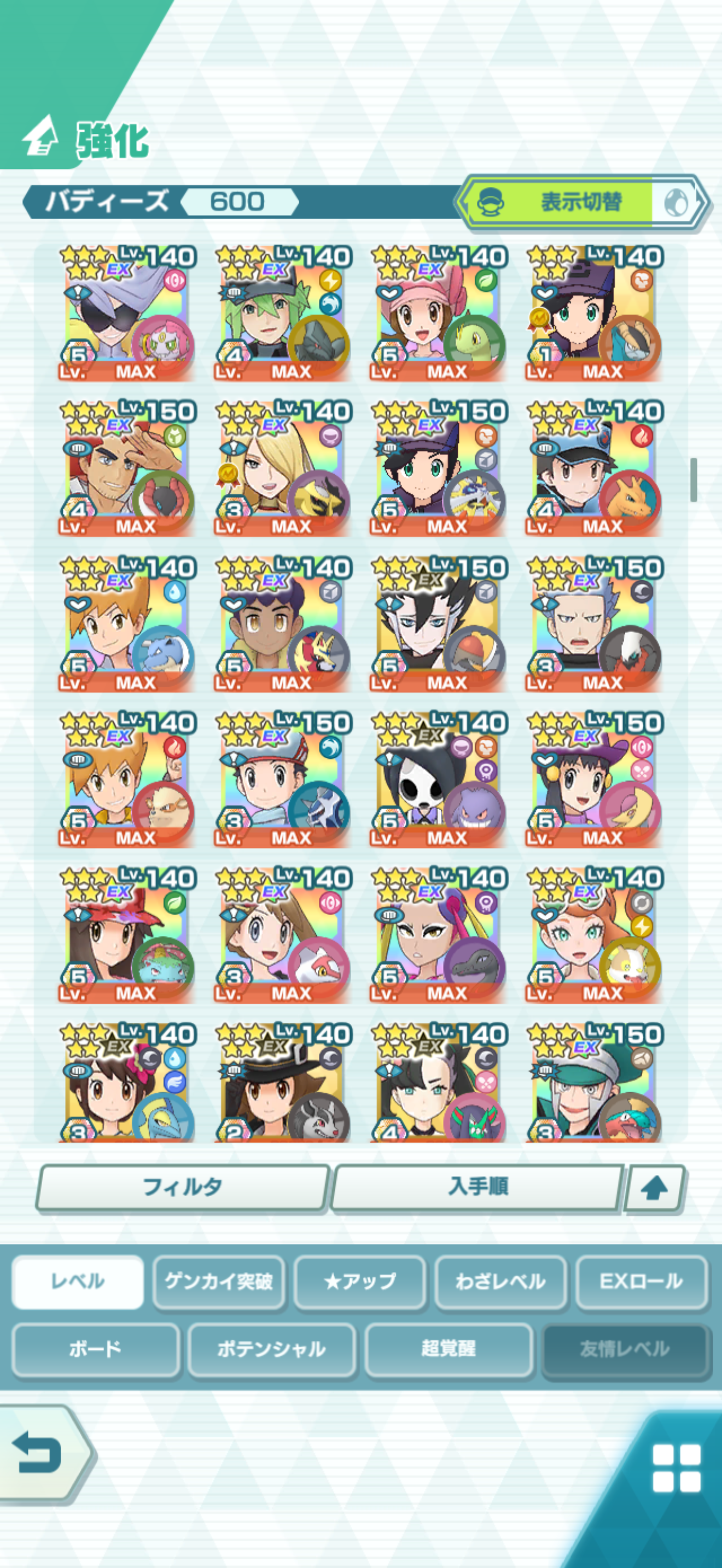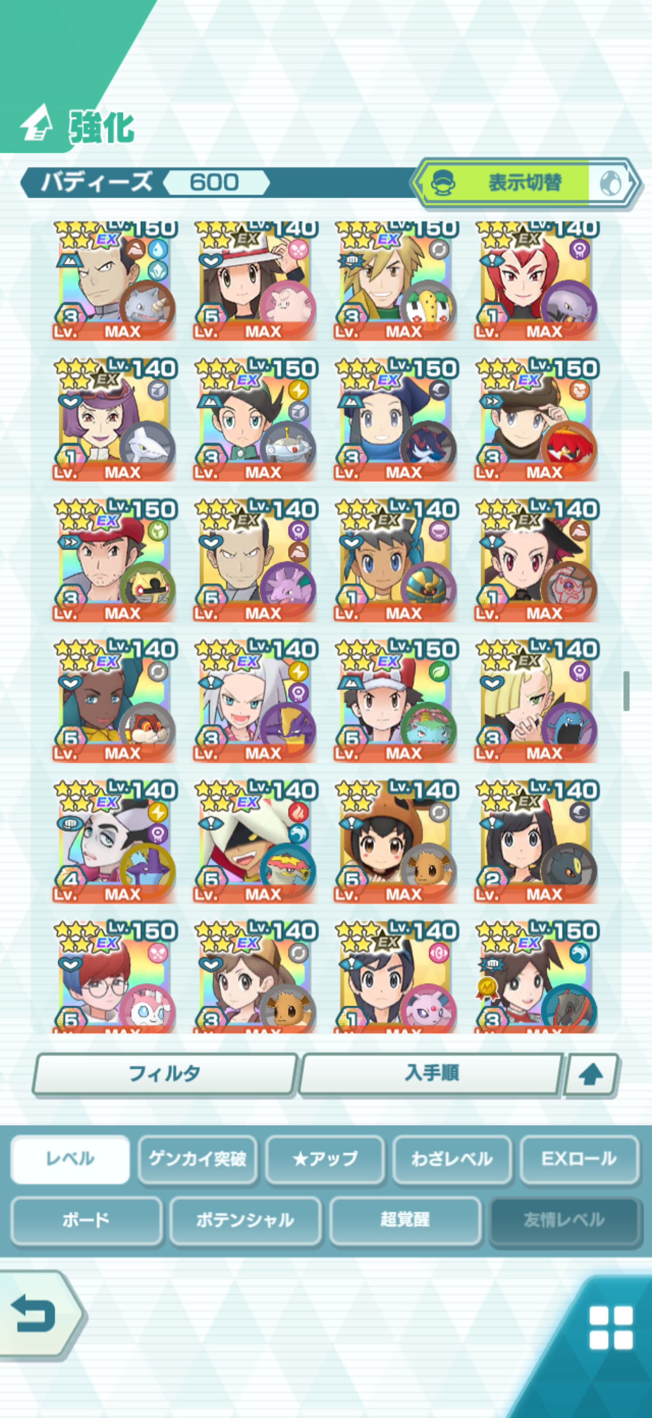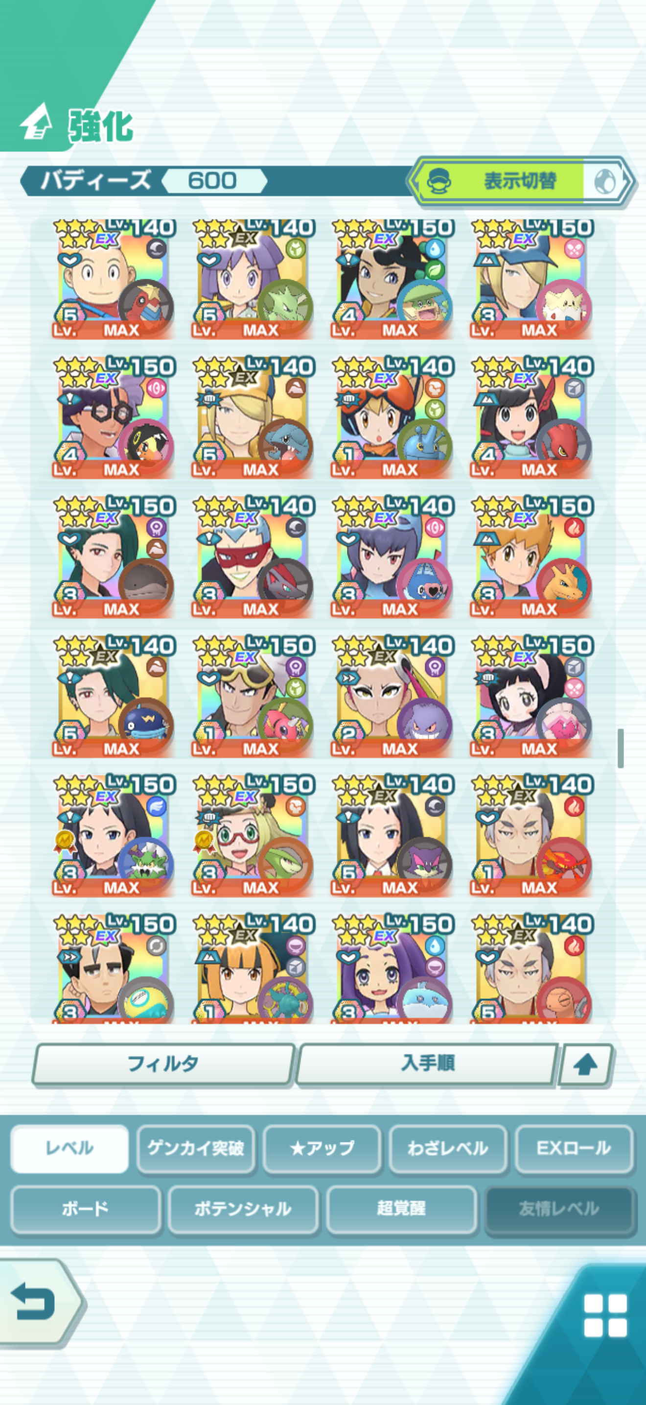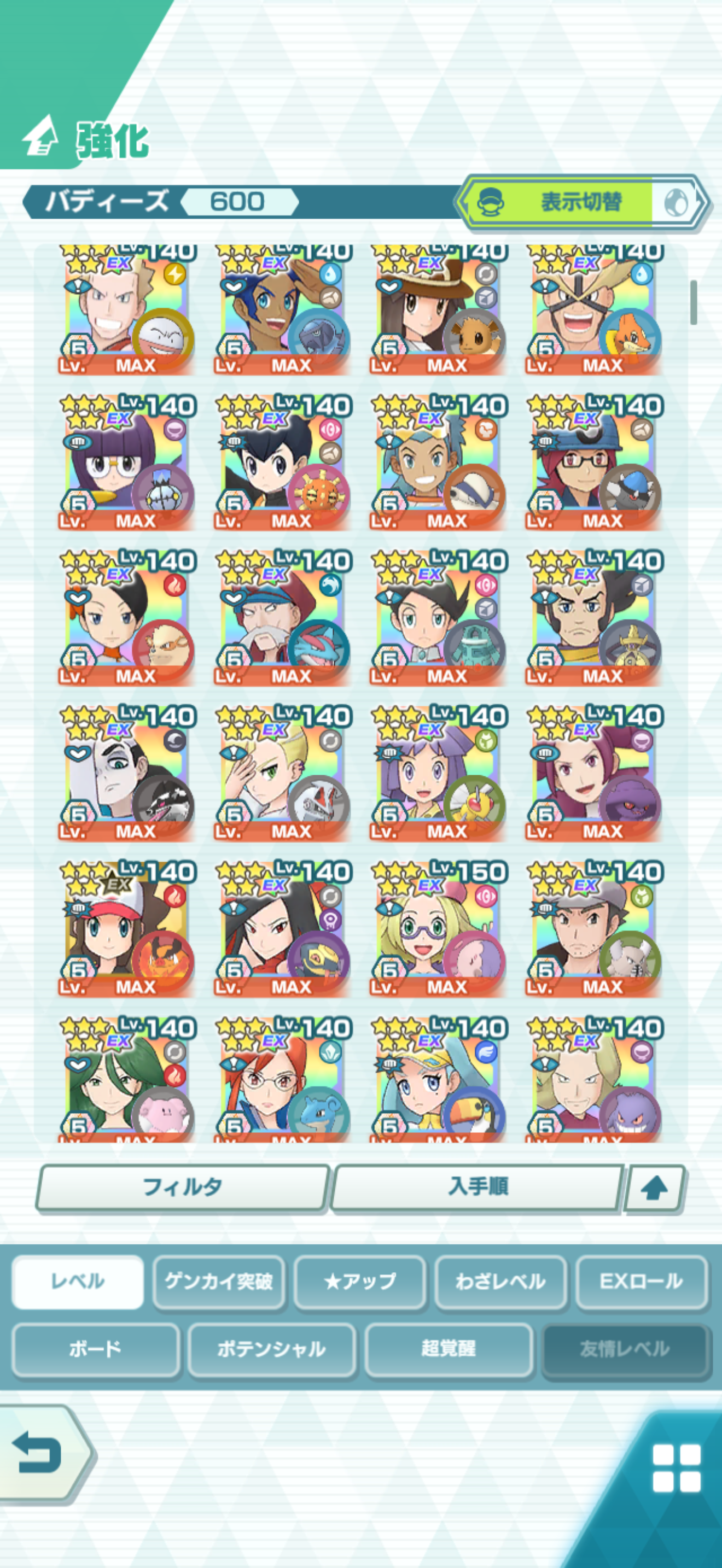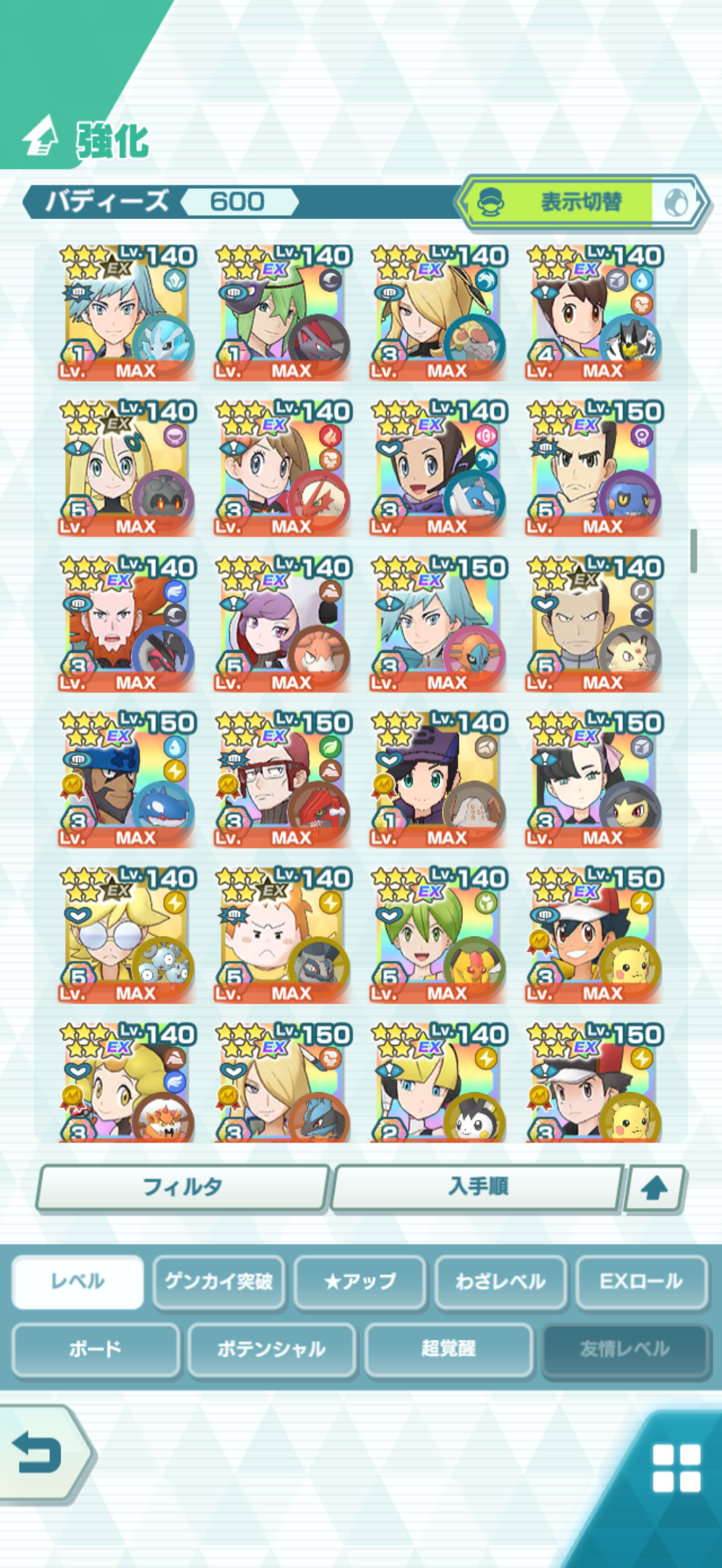 全大師拍組!!(包括兌換的大師拍組),目前全8591最高所持數(而且此所持數是不包含蛋寵!!!!)。圖鑑(600/611) 只有15角色沒拿到(實際上只有12隻沒拿到,扣掉初始御三家3隻,分別剩主角-雙奶仙(剩下5種樣子)、武藏-阿伯怪、小次郎-雙蛋瓦斯、小霞-哥達鴨(沙龍親密度未滿)。除了這15隻,這帳號擁有遊戲中所有登場的拍組。阿爾池、大師池、季節池、活動池、兌換角色、沙龍)~