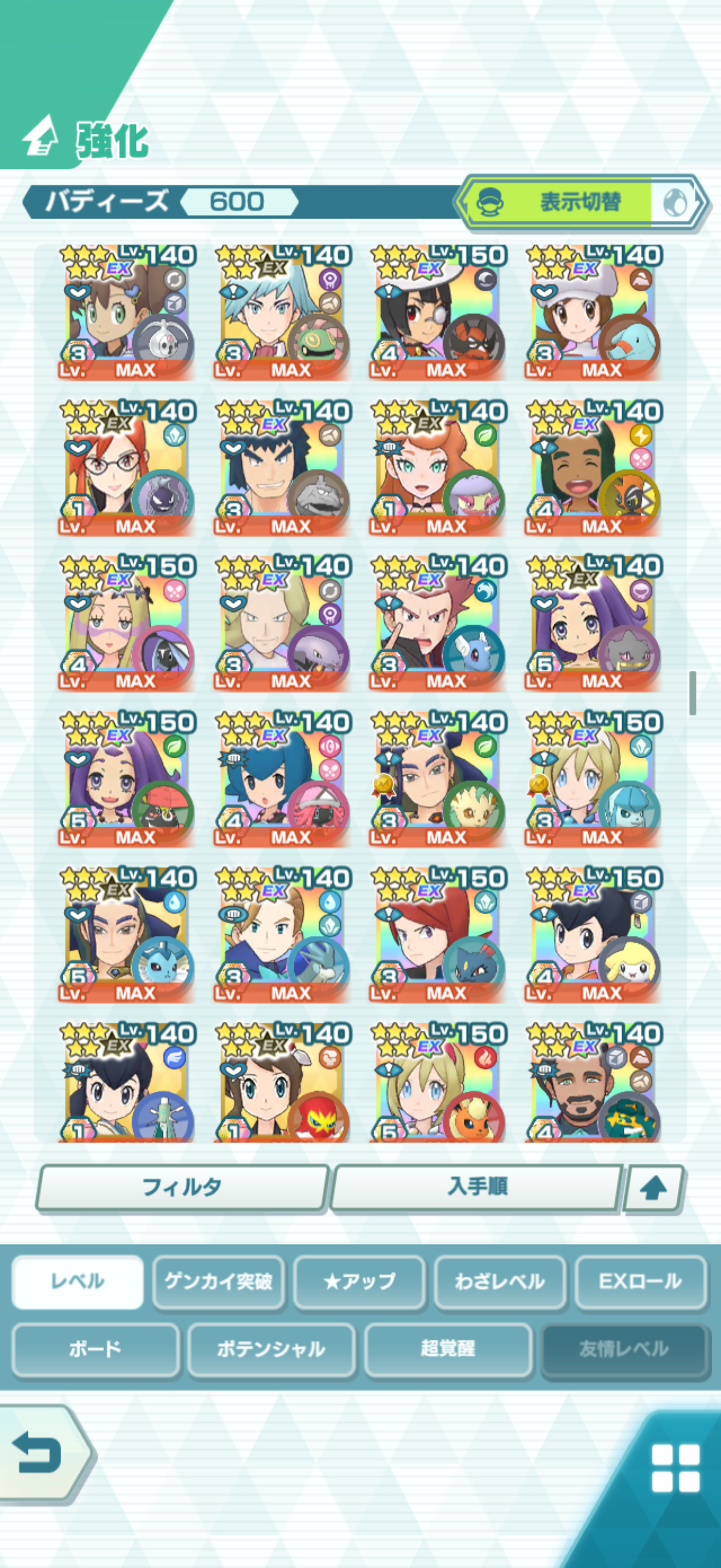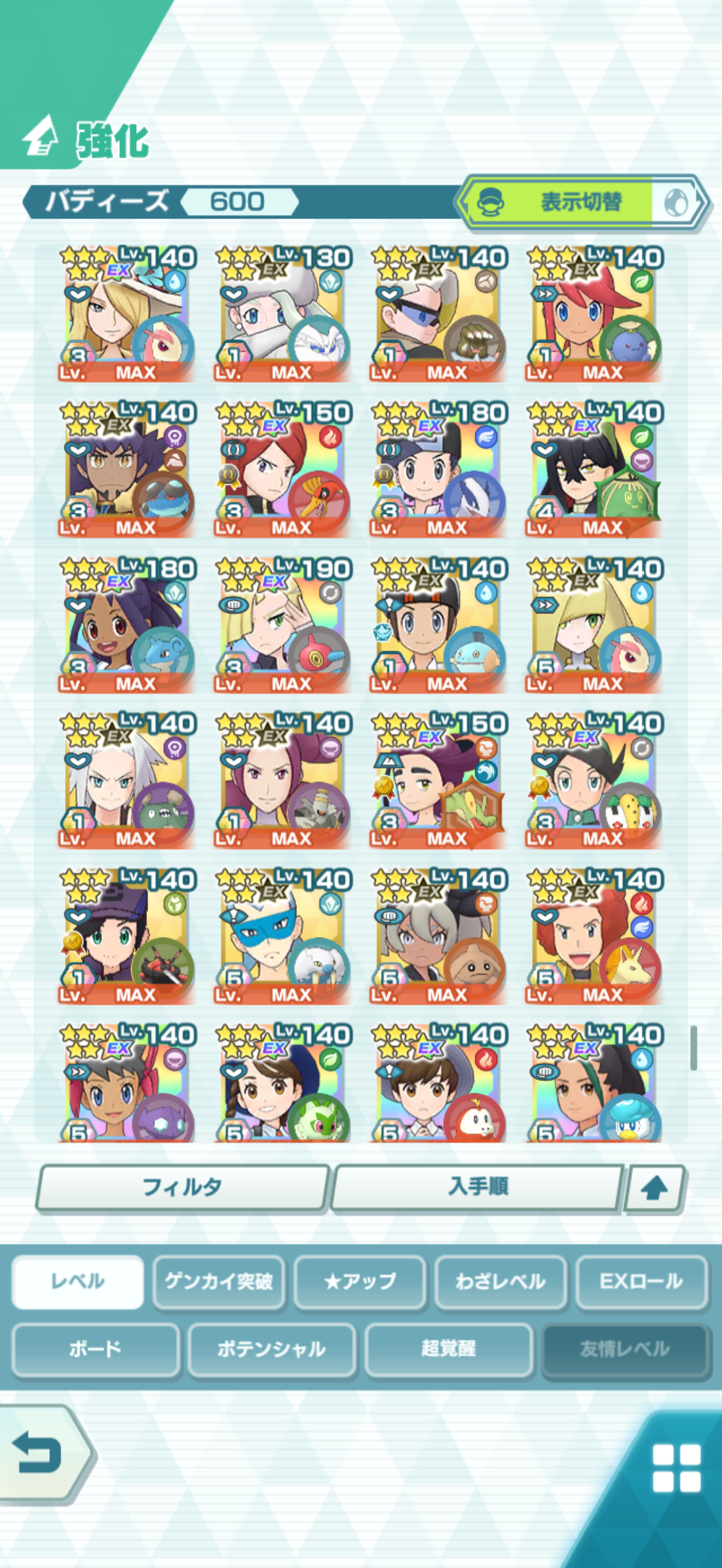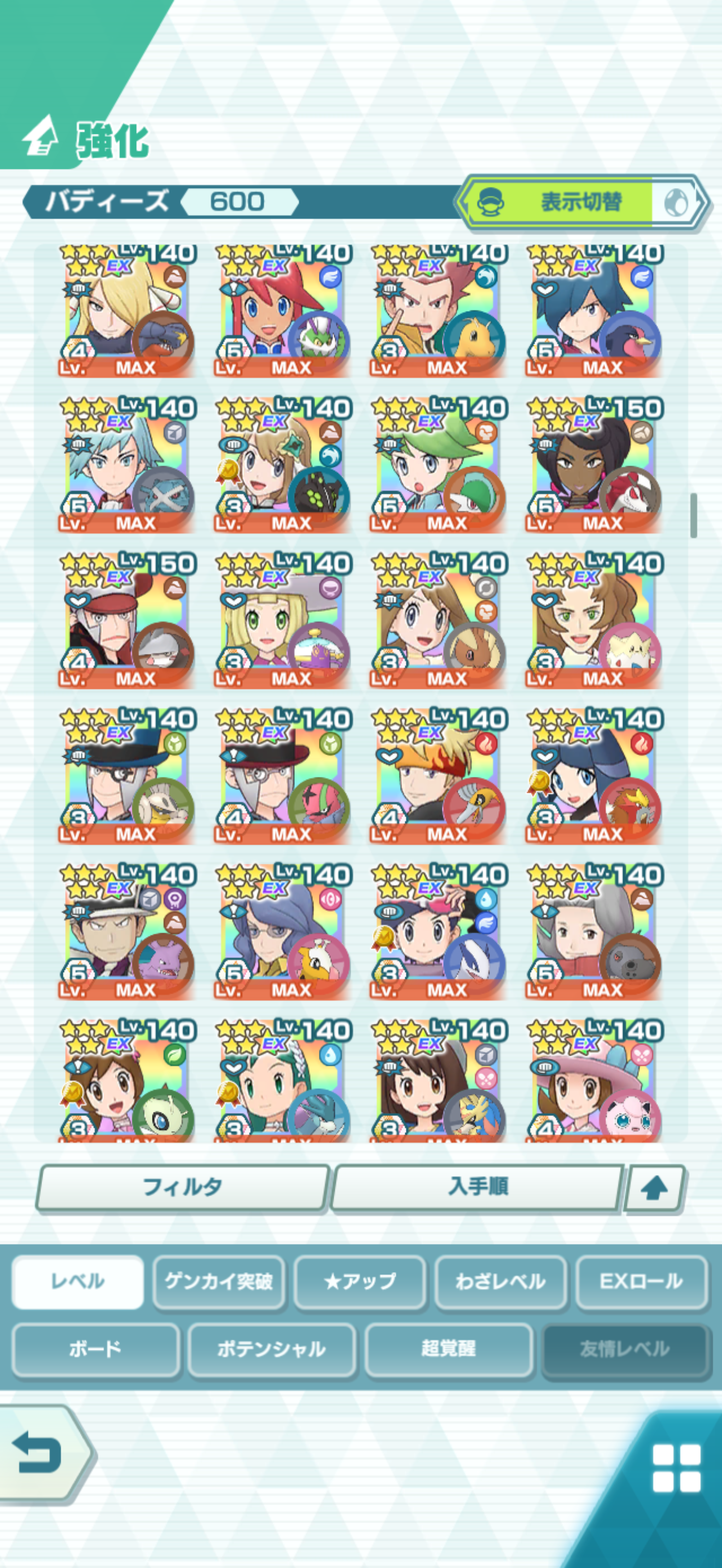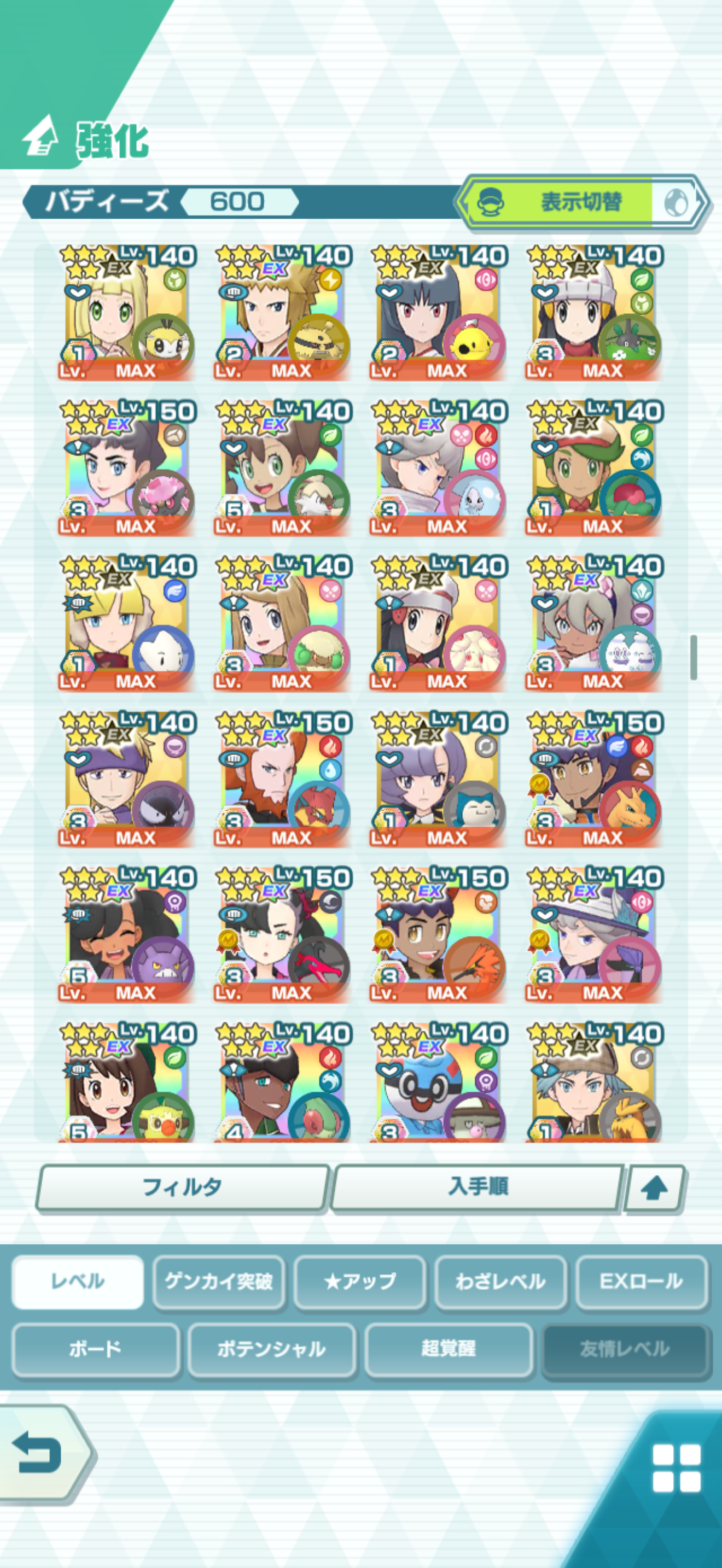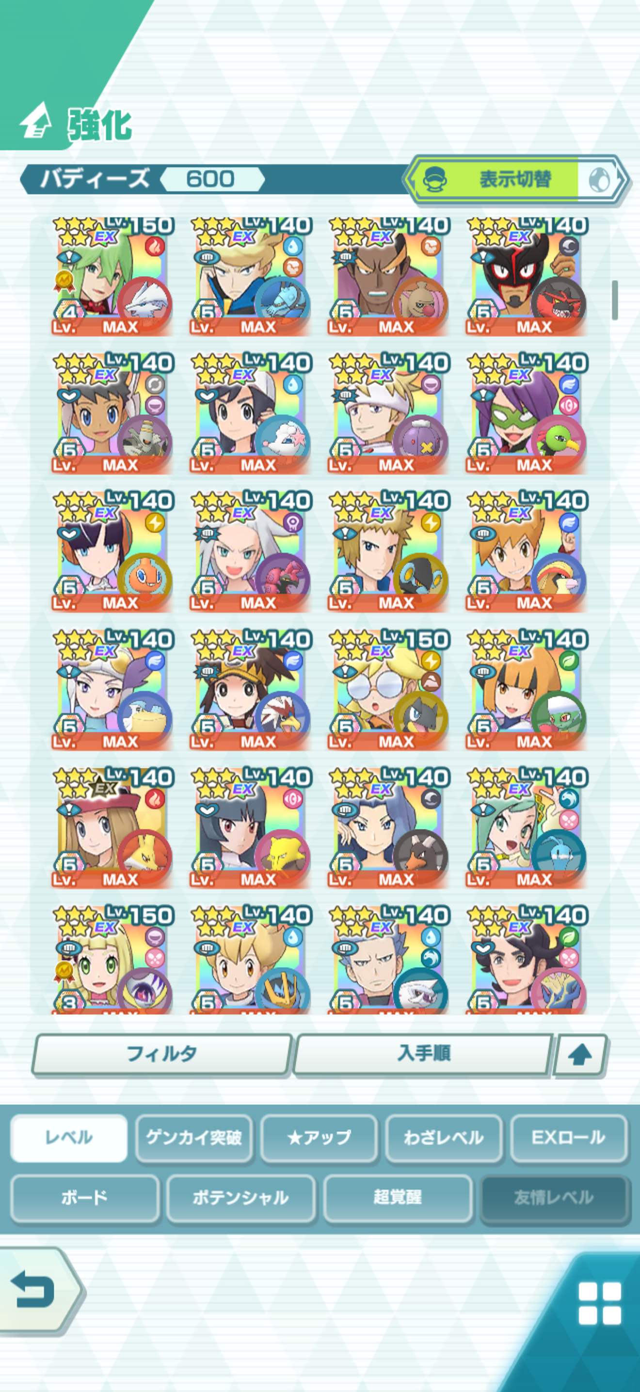 全大師拍組!!(包括兌換的大師拍組),目前全8591最高所持數(而且此所持數是不包含蛋寵!!!!)。圖鑑(600/611) 只有15角色沒拿到(實際上只有12隻沒拿到,扣掉初始御三家3隻,分別剩主角-雙奶仙(剩下5種樣子)、武藏-阿伯怪、小次郎-雙蛋瓦斯、小霞-哥達鴨(沙龍親密度未滿)。除了這15隻,這帳號擁有遊戲中所有登場的拍組。阿爾池、大師池、季節池、活動池、兌換角色、沙龍)~
