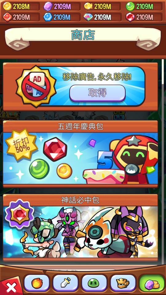 21億金幣 + 21億綠色召喚石 + 21億史詩紫色召喚石 + 21億紅色神話召喚石 + 21億特殊召喚石(限當周) + 21億魚金幣 + 21億進化石 + 21億鍛造石 + 21億藍色能量石 + 21億水/火/雷進化石 + 21億 + 去廣告禮包 + 加速2倍速禮包 = 300元