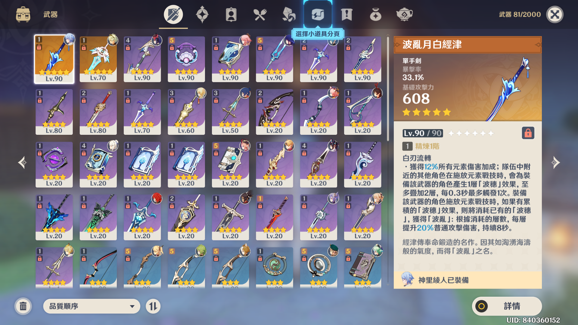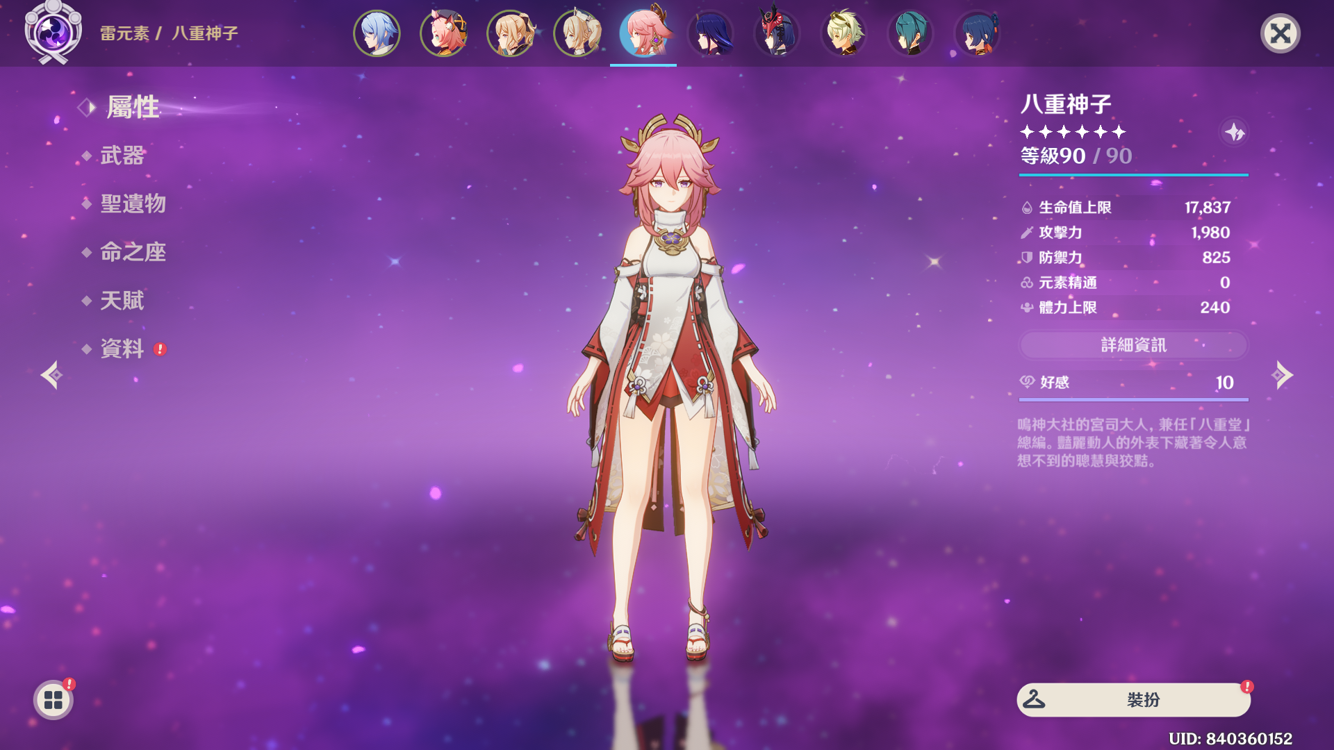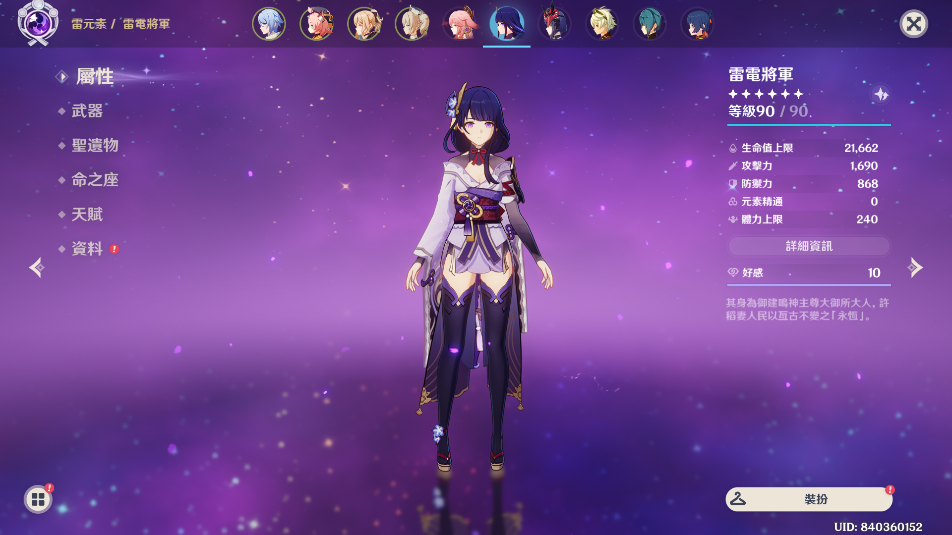 【女、55等、10金角、1金武】 雷神4命/琴1命/凌人+專武/八重老爺刻晴/雷神最高一刀40多萬傷害
