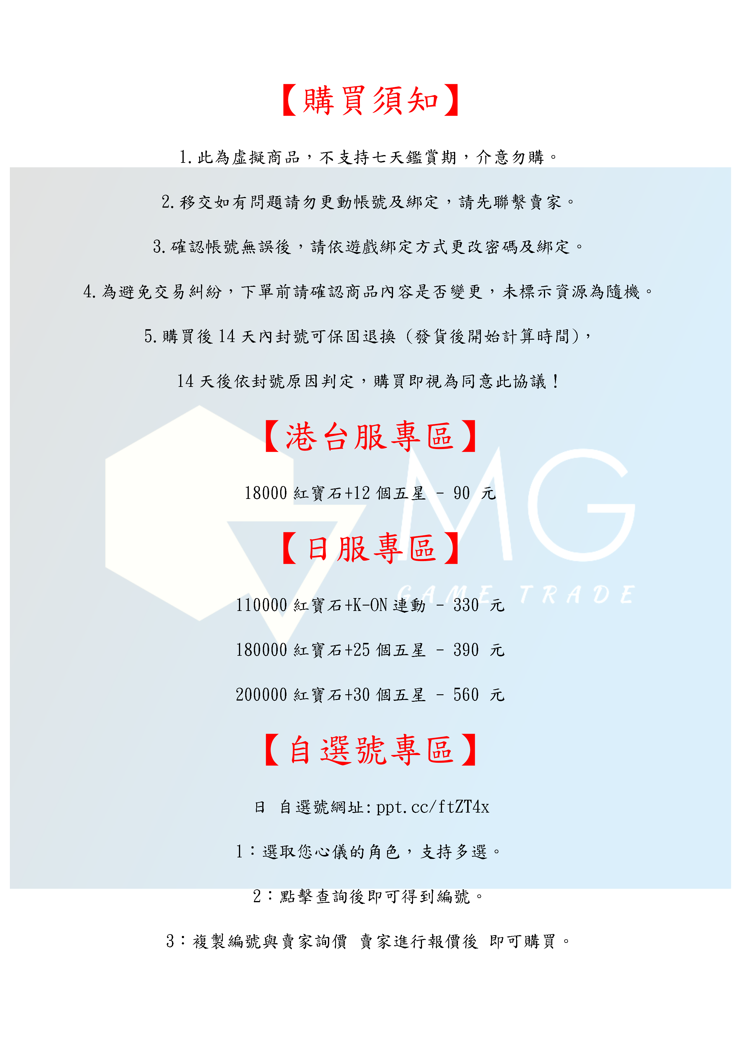 帳號 【初始號】 【MG數碼】 台服 日服 多石號 多寶石號 自抽號 初始號 自選號 自選組合
