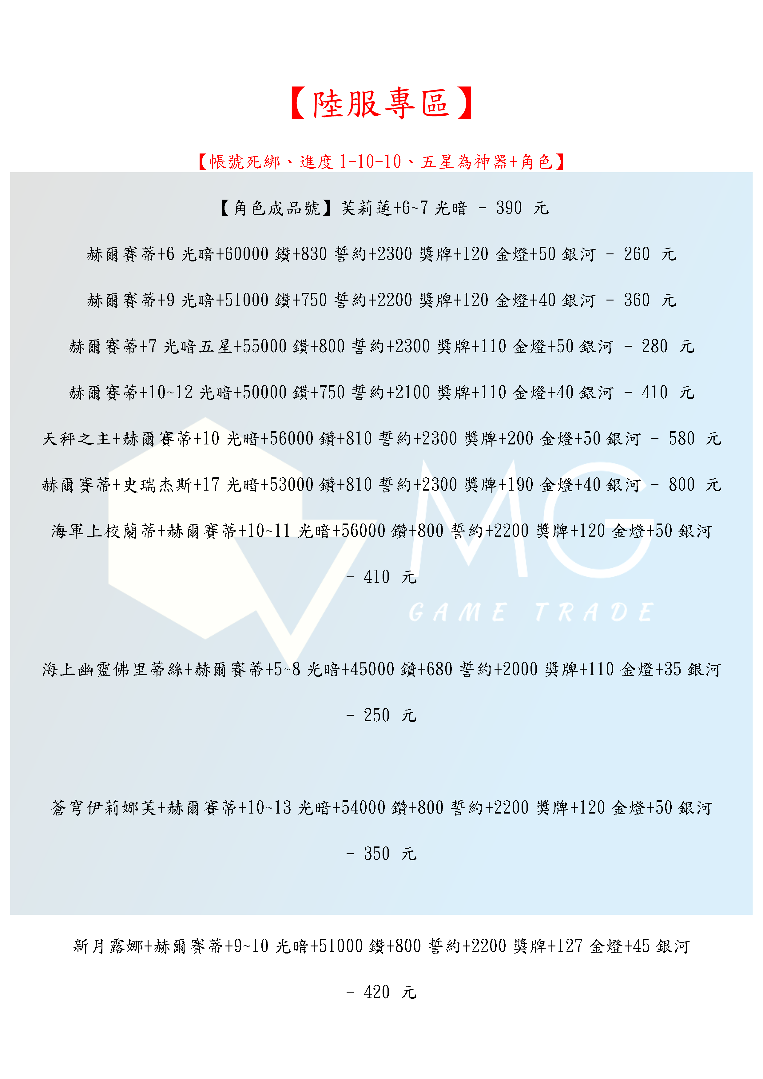 帳號 【初始號】 【MG數碼】亞服 日服 歐服 韓服 國際服 多石號 初始號 自抽號 自選組合