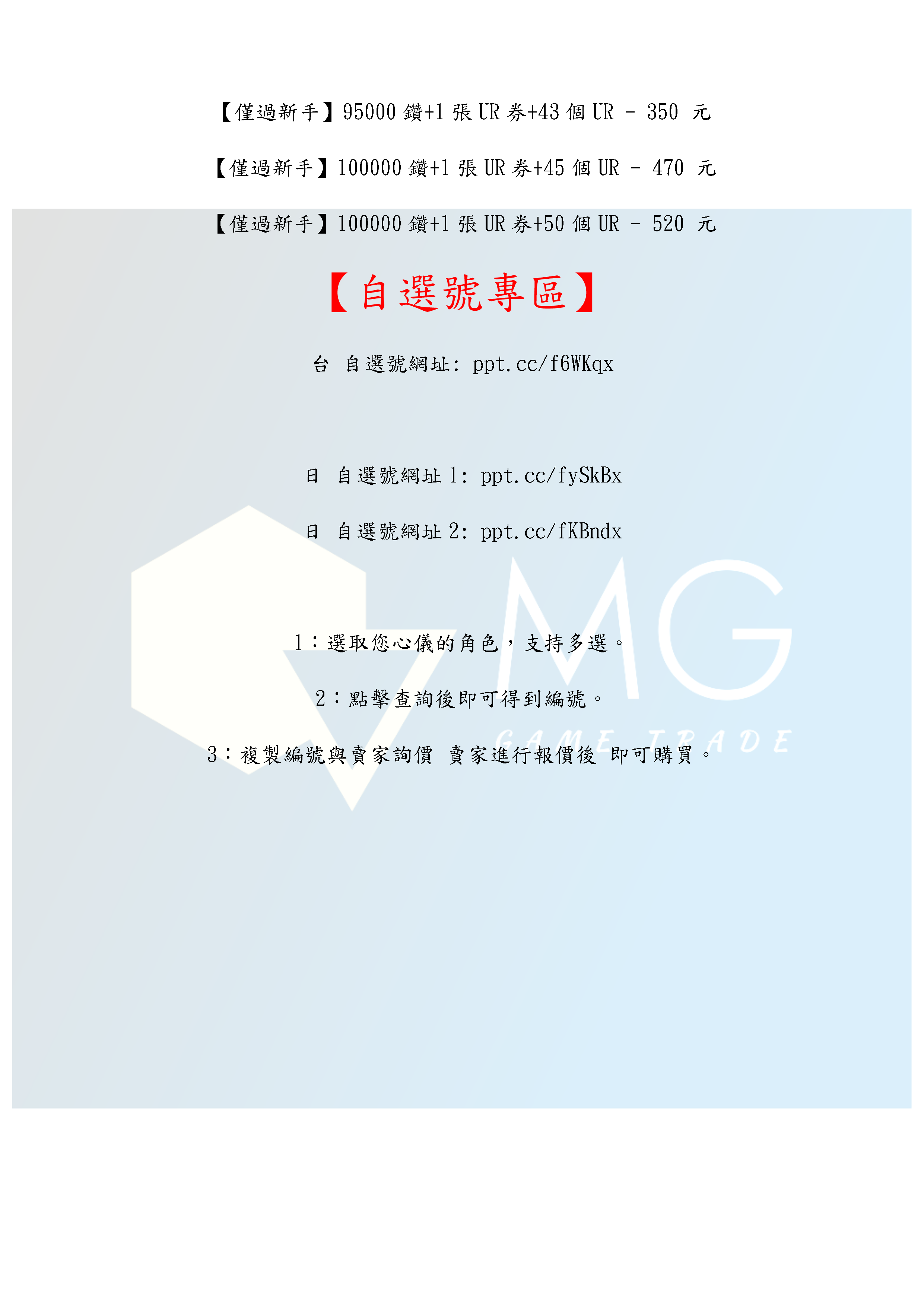 帳號 【初始號】 【MG數碼】 台服 日服 多石號 多鑽石號 初始號 自抽號 自選號 自選組合
