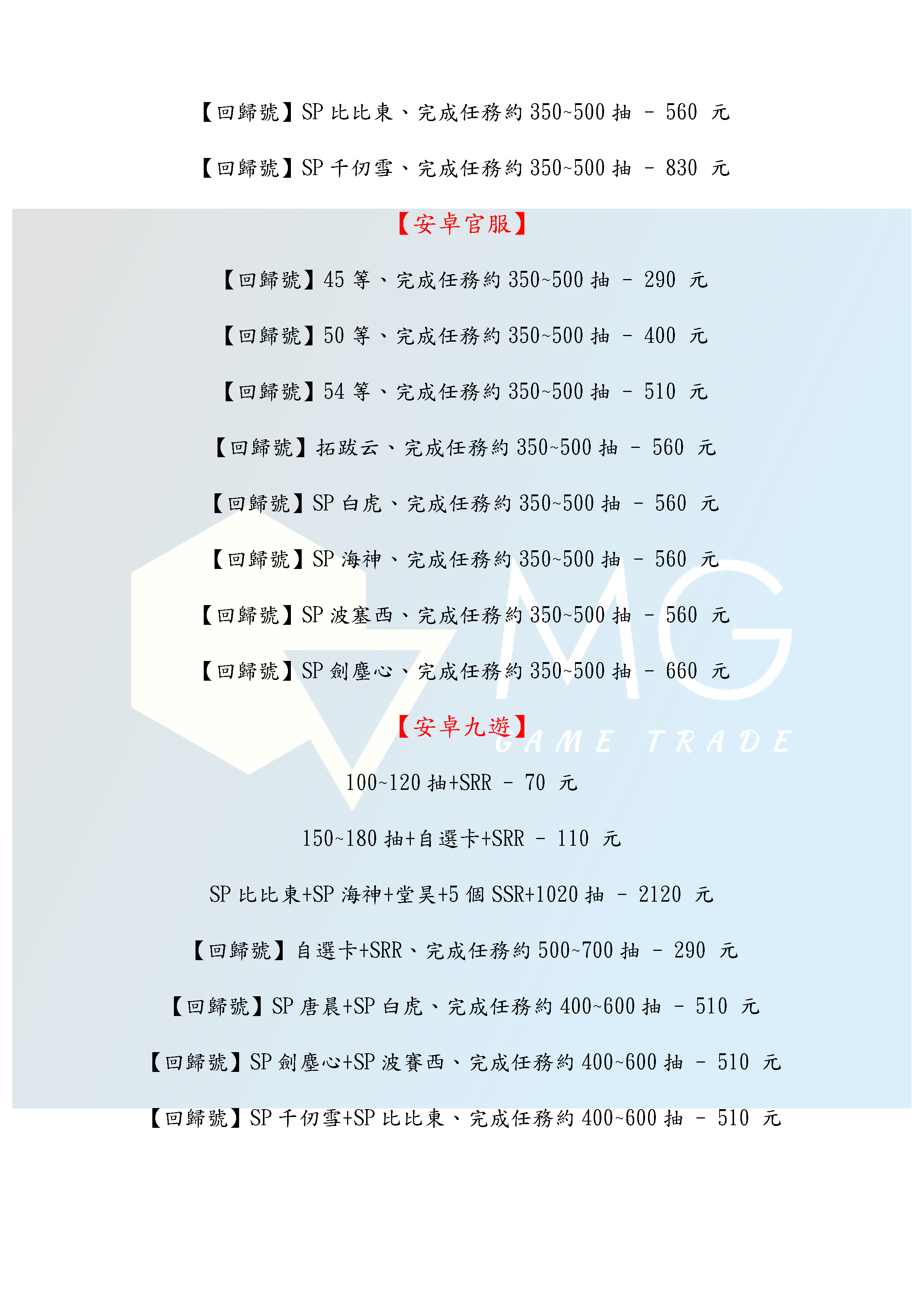 帳號 【初始號】 【MG數碼】 陸服 多抽號 多SSR號 初始號 自抽號 自選號