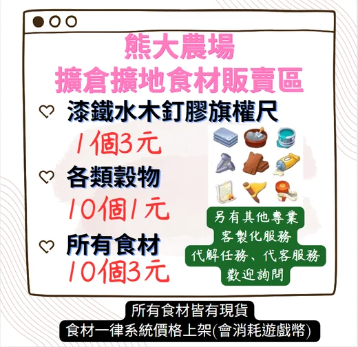 補貨活動商品食材10個3元穀物10個1元會消耗遊戲幣,上架皆為系統預設價格,不另外修改金額。
