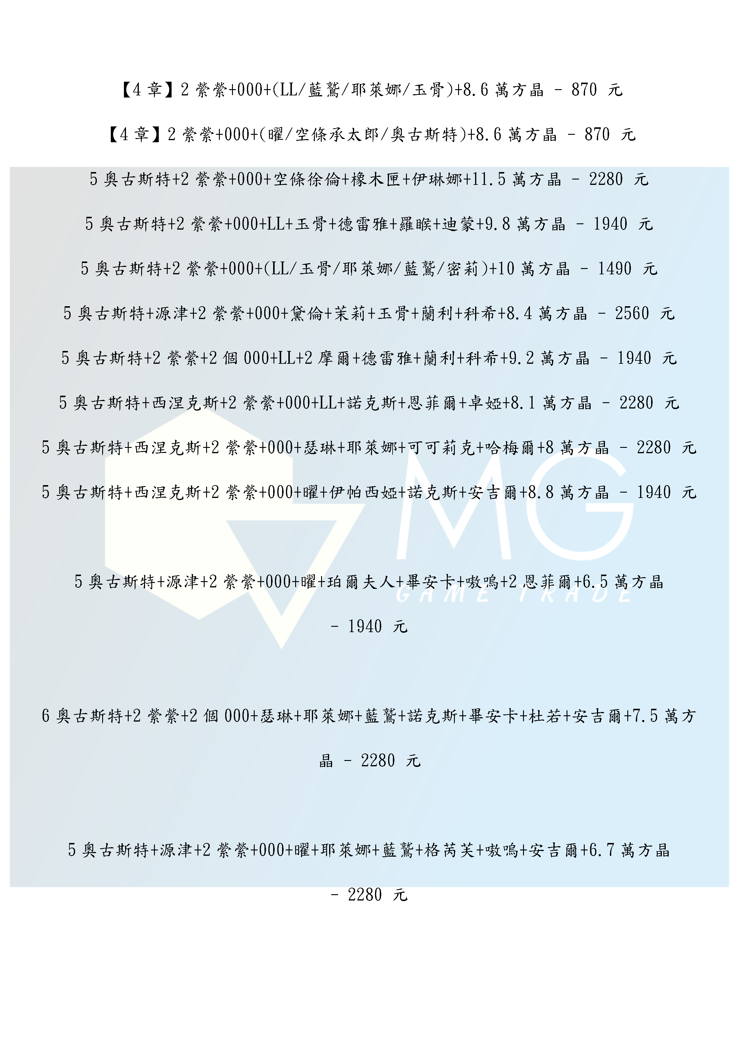 帳號 【初始號】 【MG數碼】 陸服 多石號 多方晶號 初始號 自抽號 自選號 自選組合