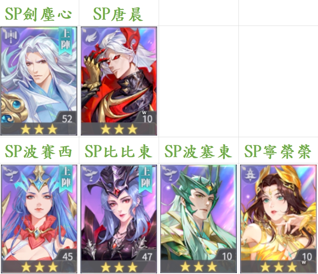 SP強攻系:千仞雪、塵心、唐昊、唐三;SP敏攻系:白虎、唐晨、小舞、朱竹清;SP控制系:波塞東、比比東、波賽西、海神唐三;SP輔助系:寧榮榮、奧斯卡、千道流
