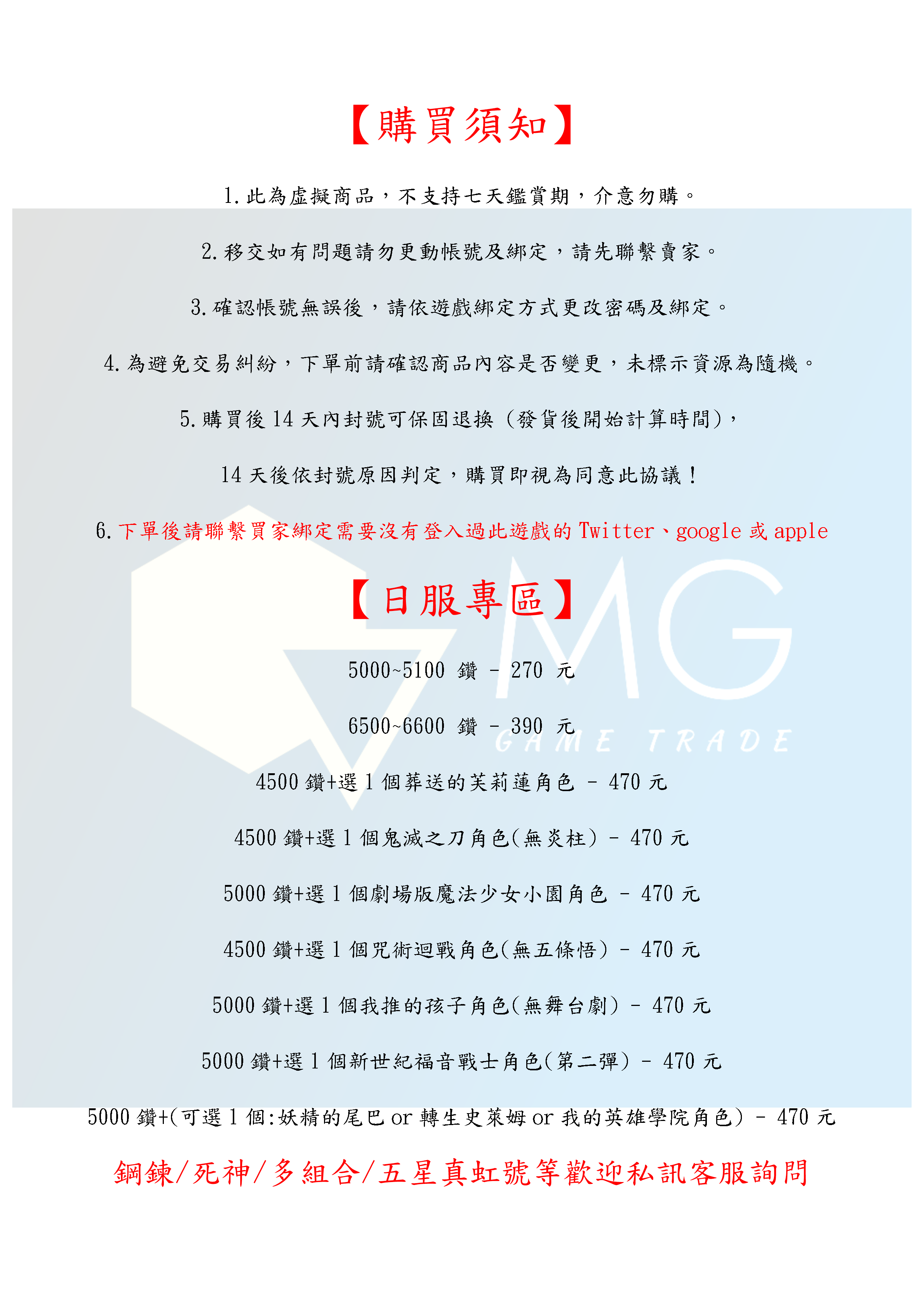 6.下單後請聯繫買家綁定需要沒有登入過此遊戲的Twitter、google或apple