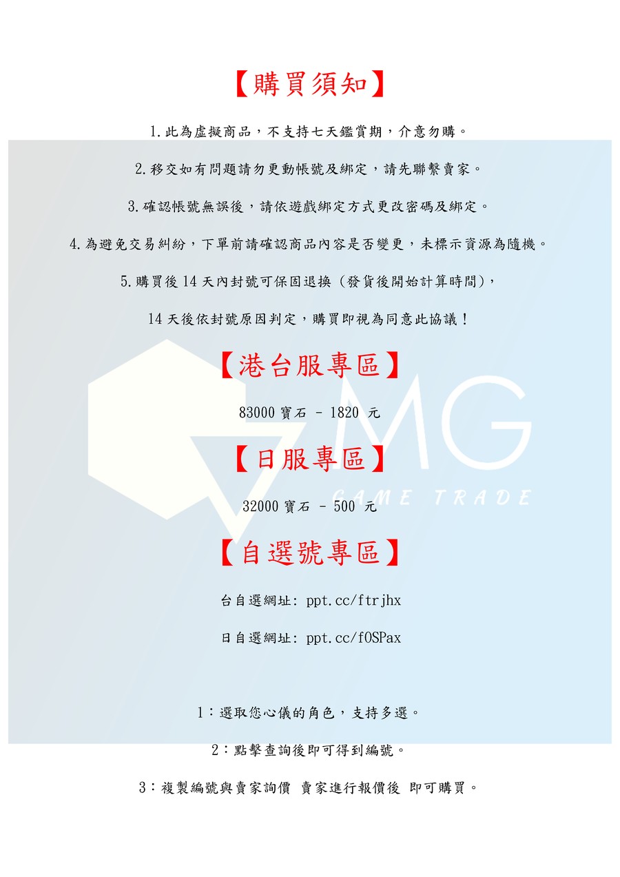 1.此為虚擬商品,不支持七天鑑賞期,介意勿購。 2.移交如有問題請勿更動帳號及綁定,請先聯繫賣家。 3.確認帳號無誤後,請依遊戲綁定方式更改密碼及綁定。 4.為避免交易糾紛,下單前請確認商品內容是否變更,未標示資源為隨機。 5.購買後14天內封號可保固退換 (發貨後開始計算時間), 14天後依封號原因判定,購買即視為同意此協議!