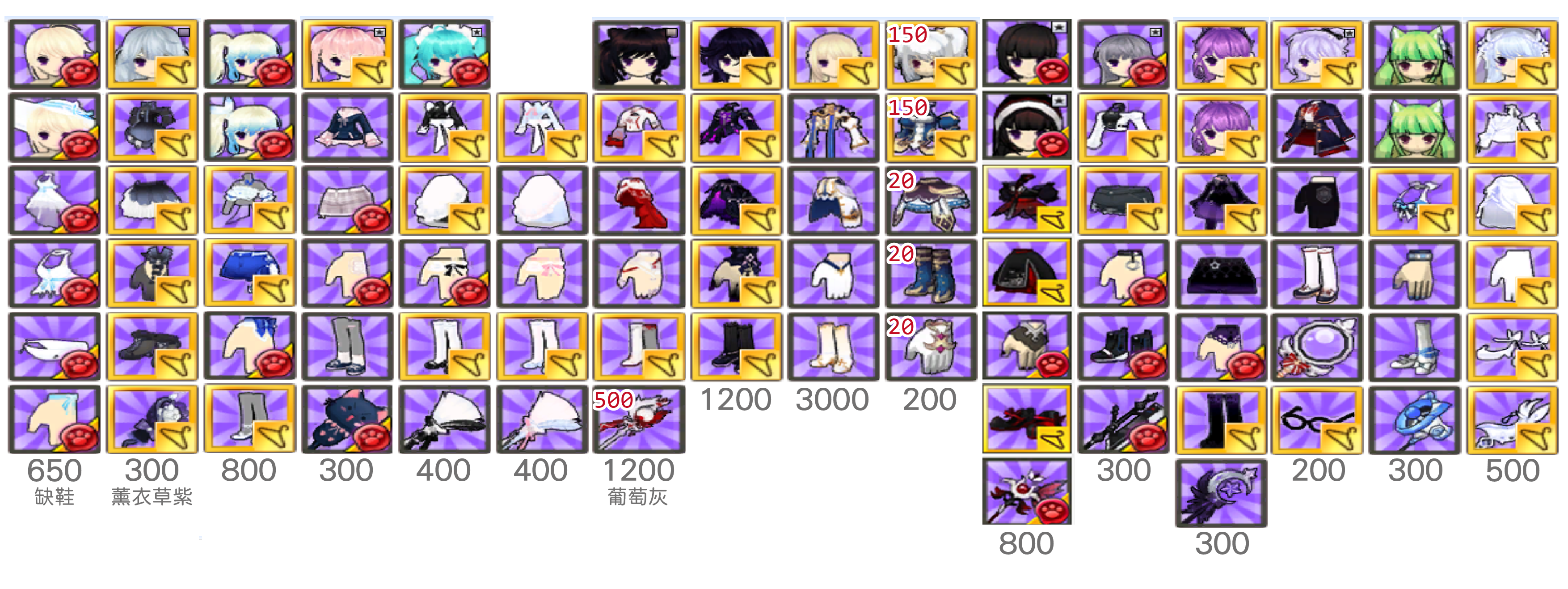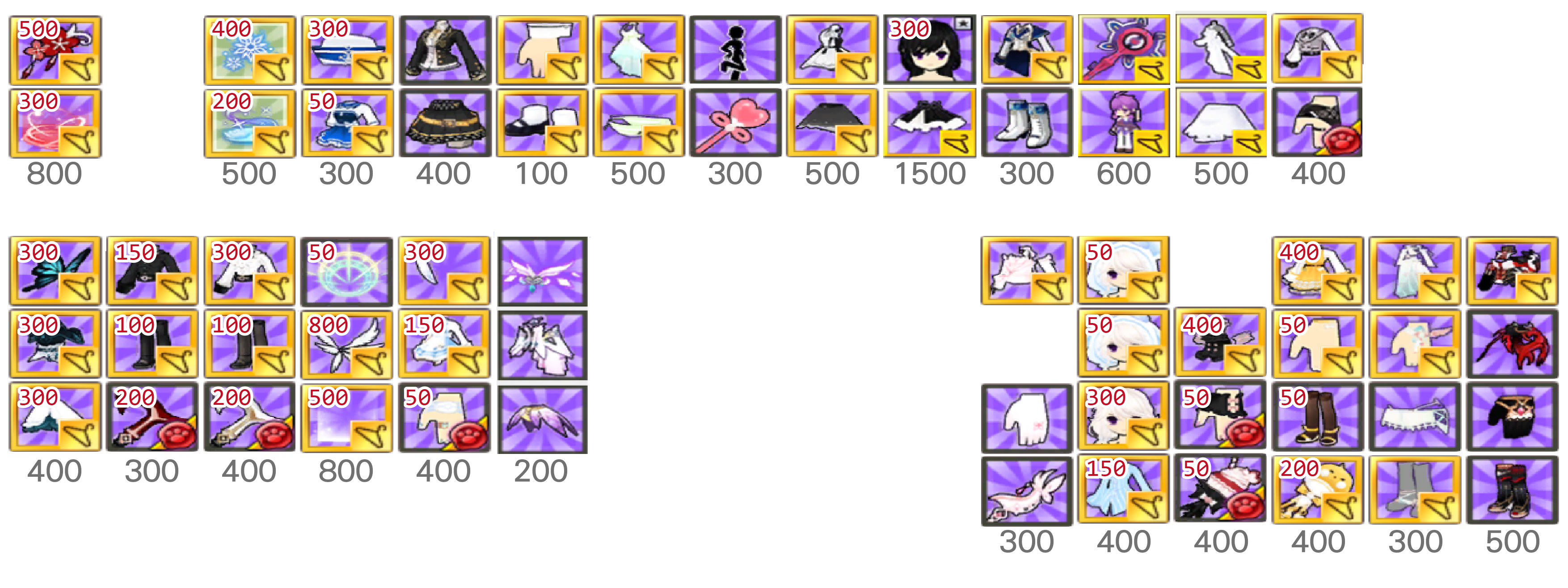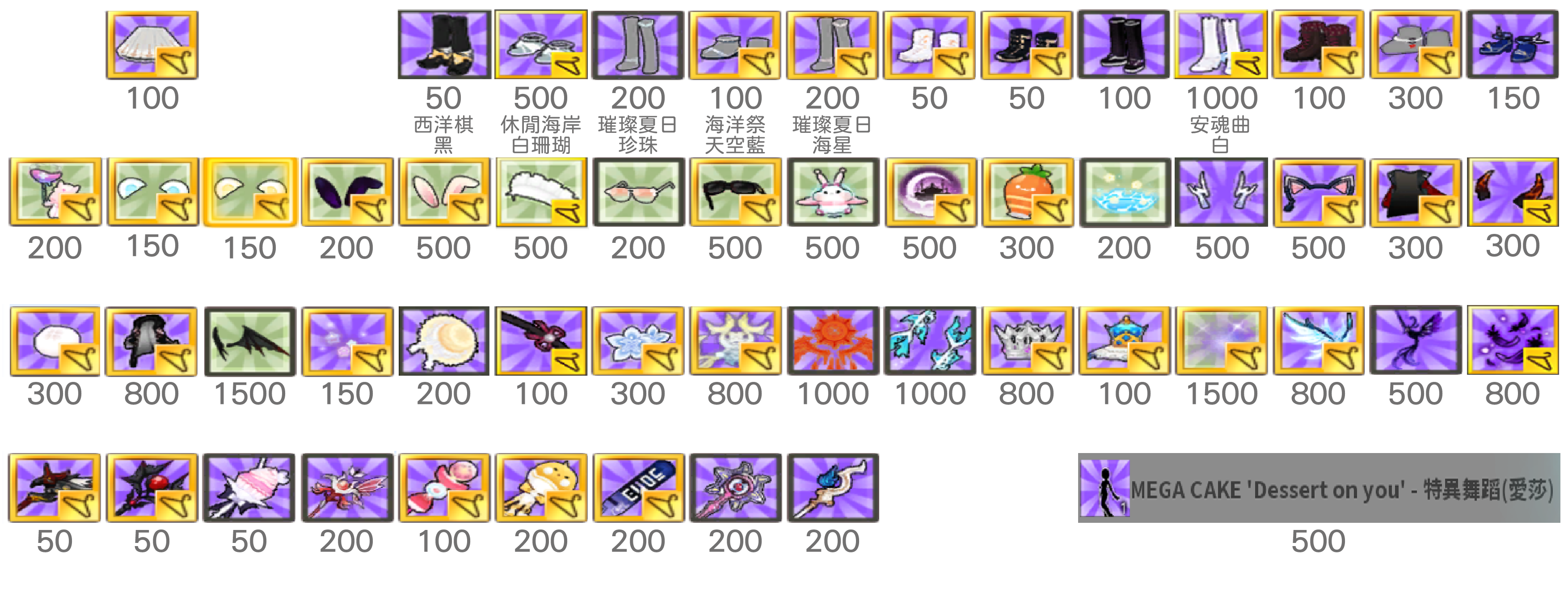 白封24/衣櫥髮型上下75/手鞋36/武器飾品105/連身150
