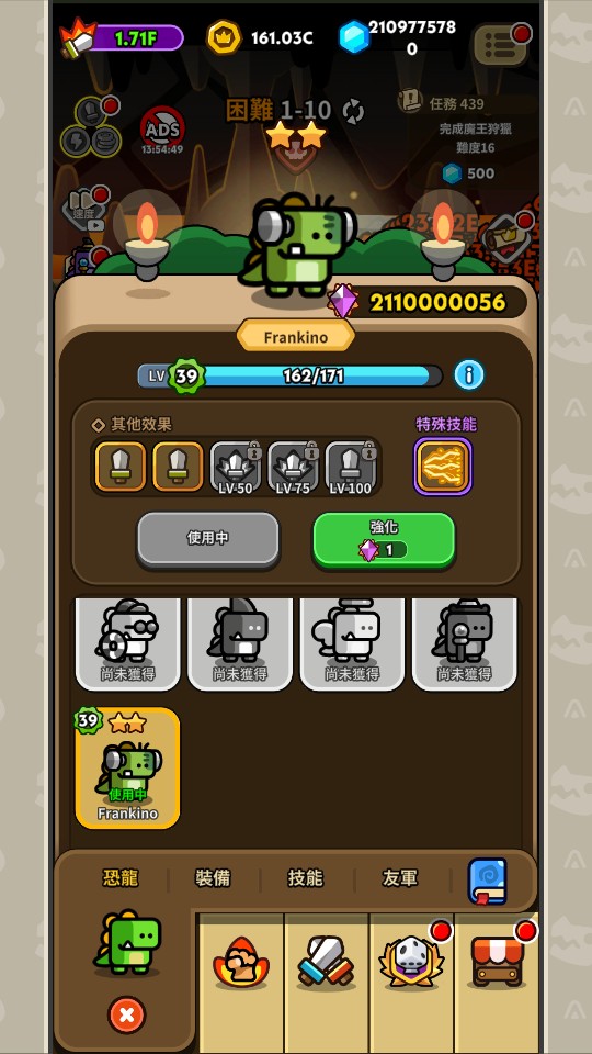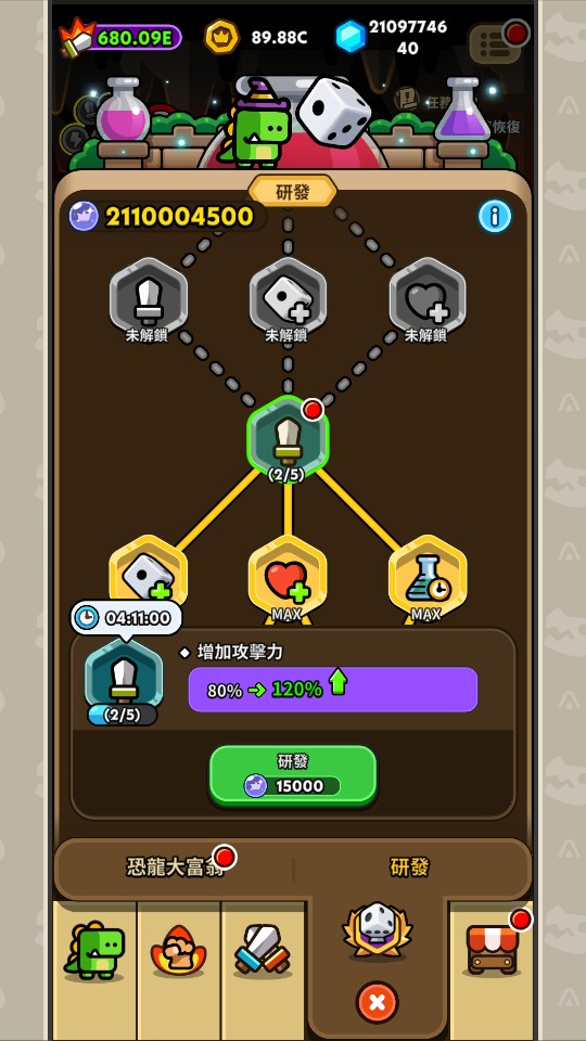 代練 Hero Dino 海量金幣/鑽石/強化石/遺物/技能/研發/骰子/鑰史等道具