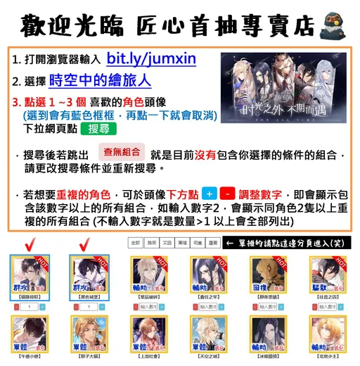 1. 進入網址 【 bit.ly/jumxin 】 查詢組合