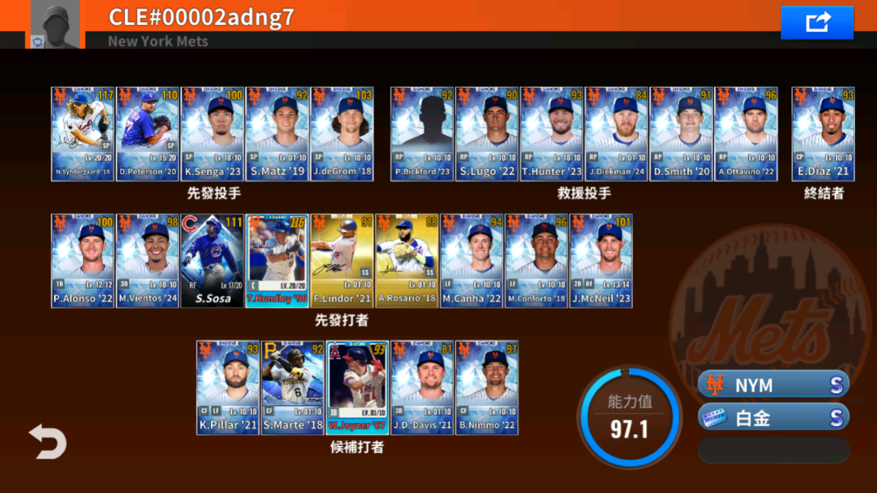 20 J.deGrom白金簽+23 A.Ottavino白金簽+21 J.Villar白金簽+71 B.Harrelson金簽+17 T.d'Arnaud金簽+19 P.Alonso金簽+22 M.Scherzer金簽+卓越白金 R.Halladay 3600