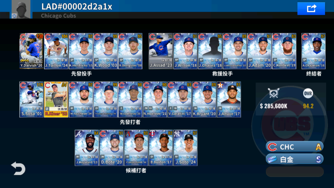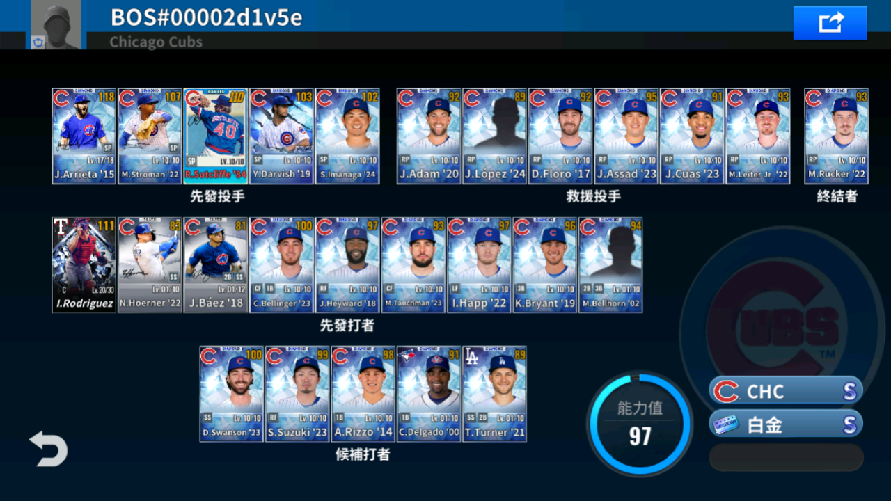 15 J.Arrieta白金簽+22 M.Stroman白金簽+84 R.Sutcliffe白金簽+18 J.Baez銀簽+22 N.Hoerner銀簽+24 T.Miller金簽+卓越黑鑽 I.Rodriguez+1球選簽 4500