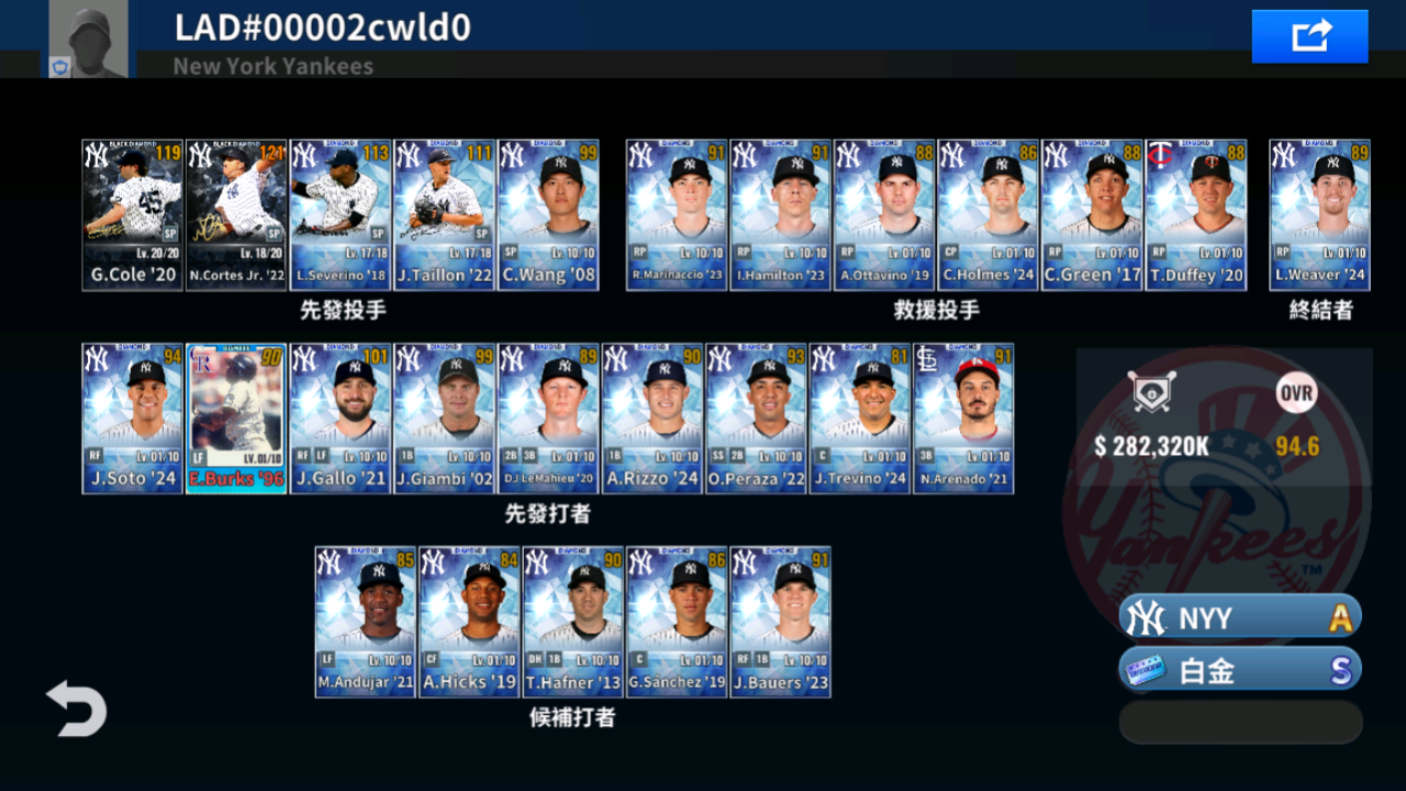 21 M.Scherzer黑鑽簽+16 J.Pederson金簽+20 M.Betts金簽+85 T.Niedenfuer金簽+53 D.Snider金簽+85 P.Guerrero金簽+21 B.Treinen金簽+24 A.Vesia金簽+15 K.Jansen金簽+1升階 5000