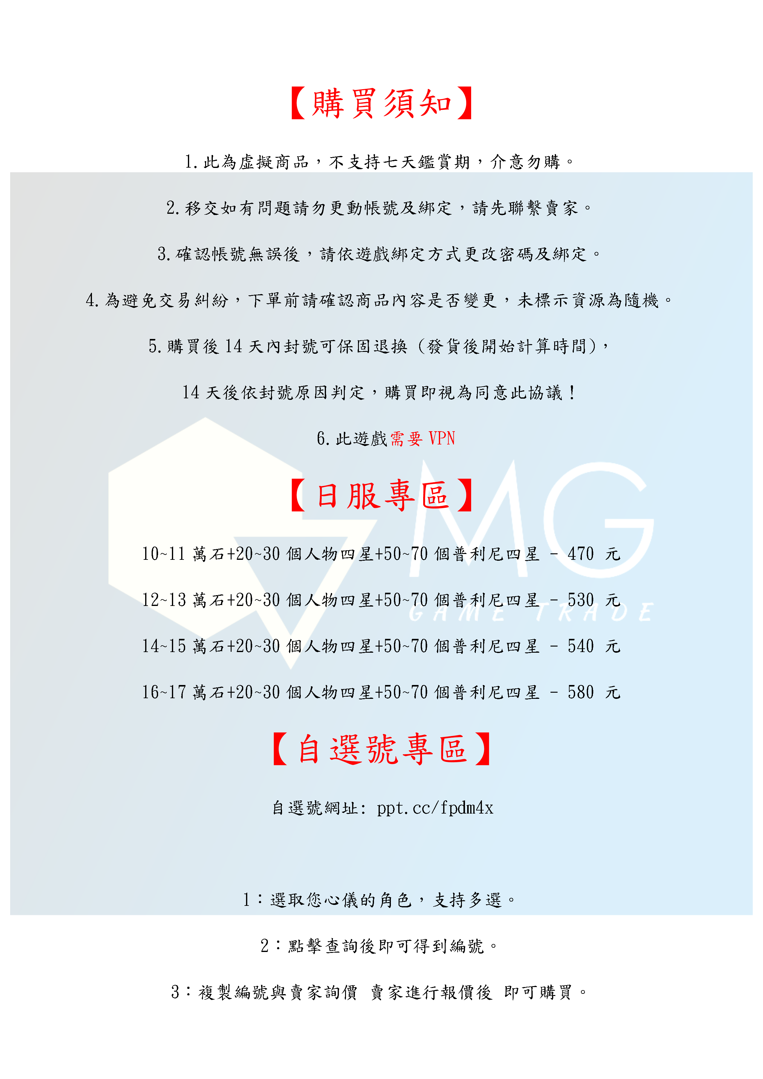 帳號 【初始號】 【MG數碼】 日服 多石號 多魔晶石號 初始號 自抽號 自選號 自選組合