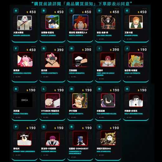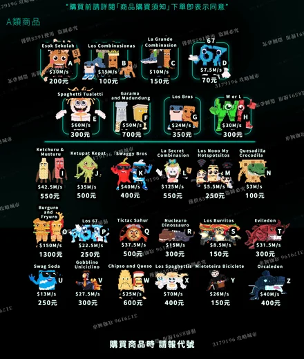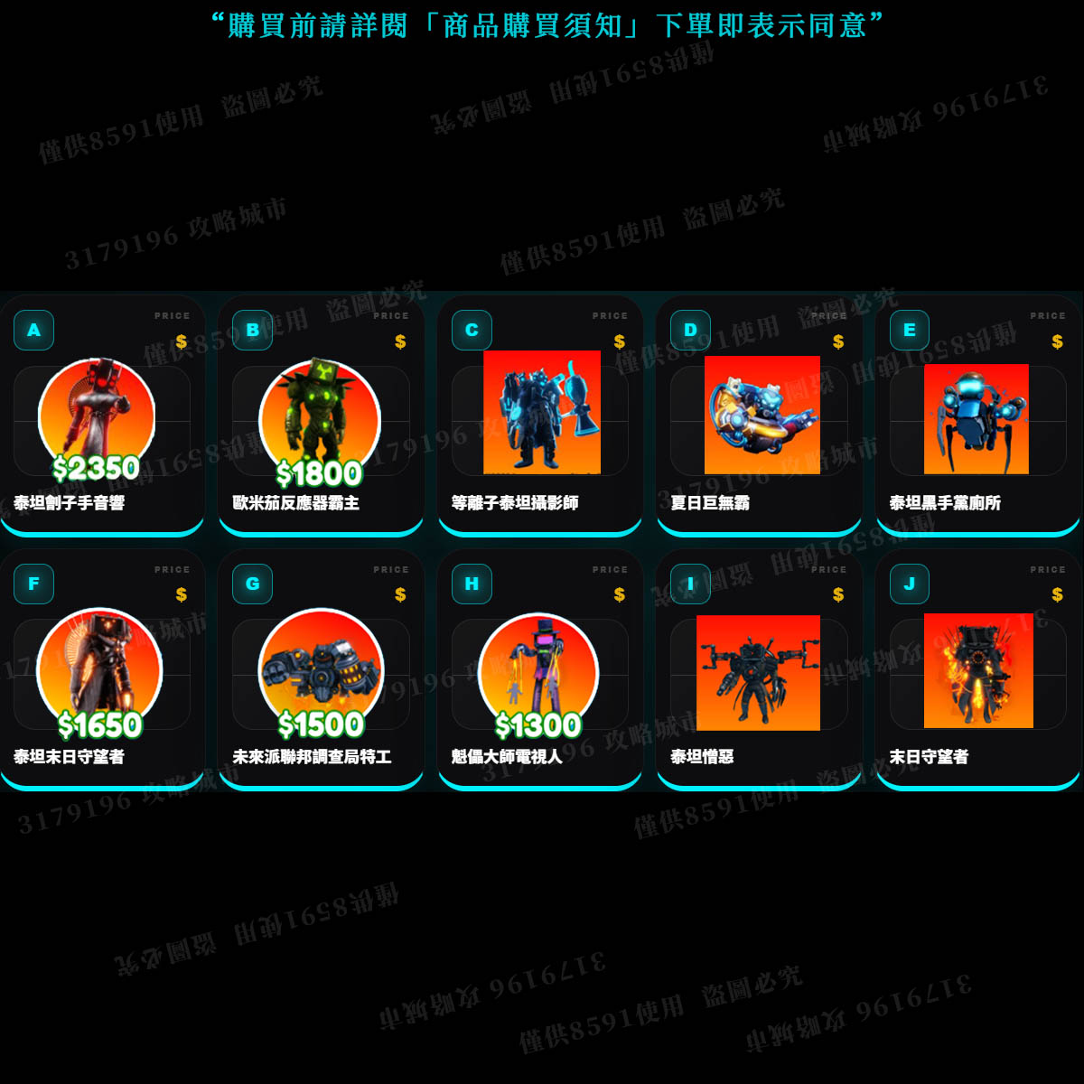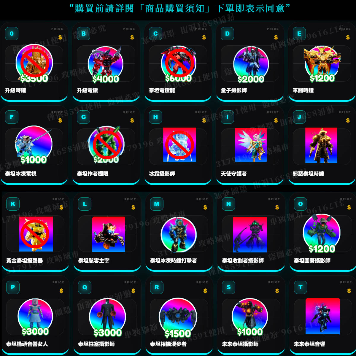 | 🔸A01 工程師 150元 | 🔸A02 廚師 100元 | 🔸A03 萬神 250元 | 🔸A04 DJ電視 960元 | 🔸A05 幸運泰坦 220元 | 🔸A06 神聖首席鐘 530元 |