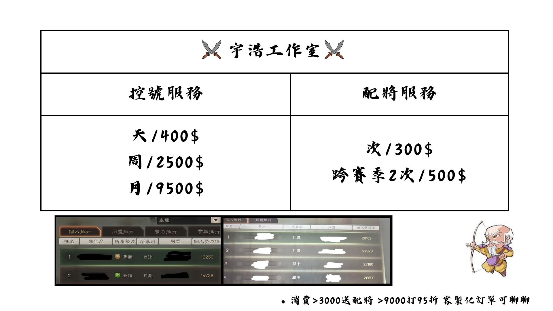 宇浩工作室控號、開荒,配將建議等等 價目表最後一張