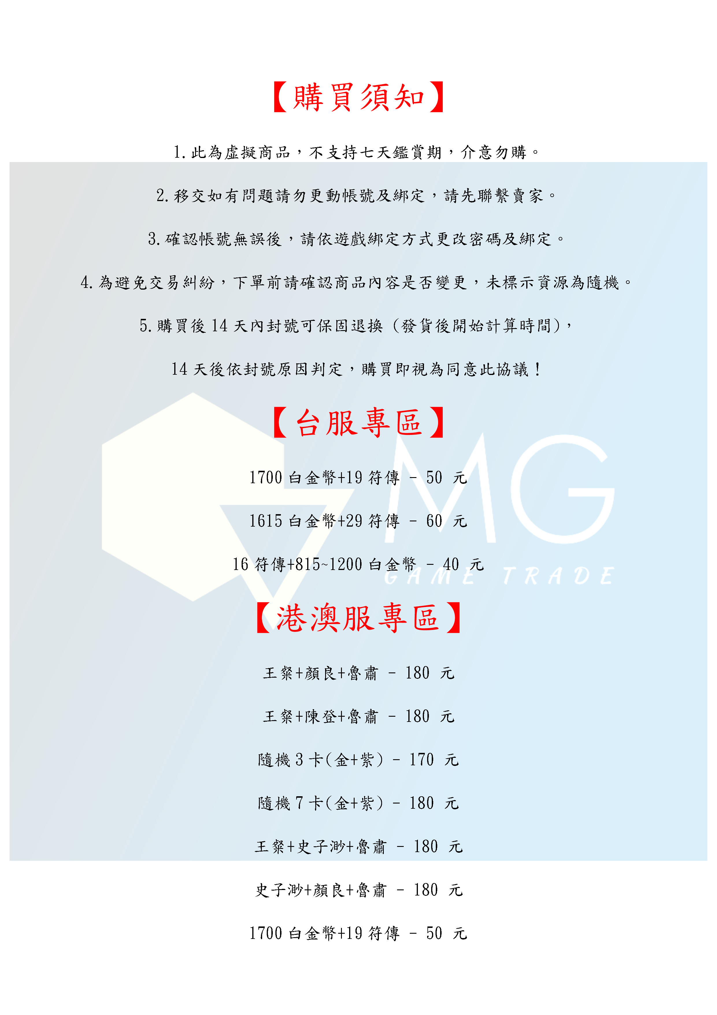 帳號 【初始號】 【MG數碼】台服 港服 陸服 多石號 多代幣號 初始號 自抽號 自選號 自選組合